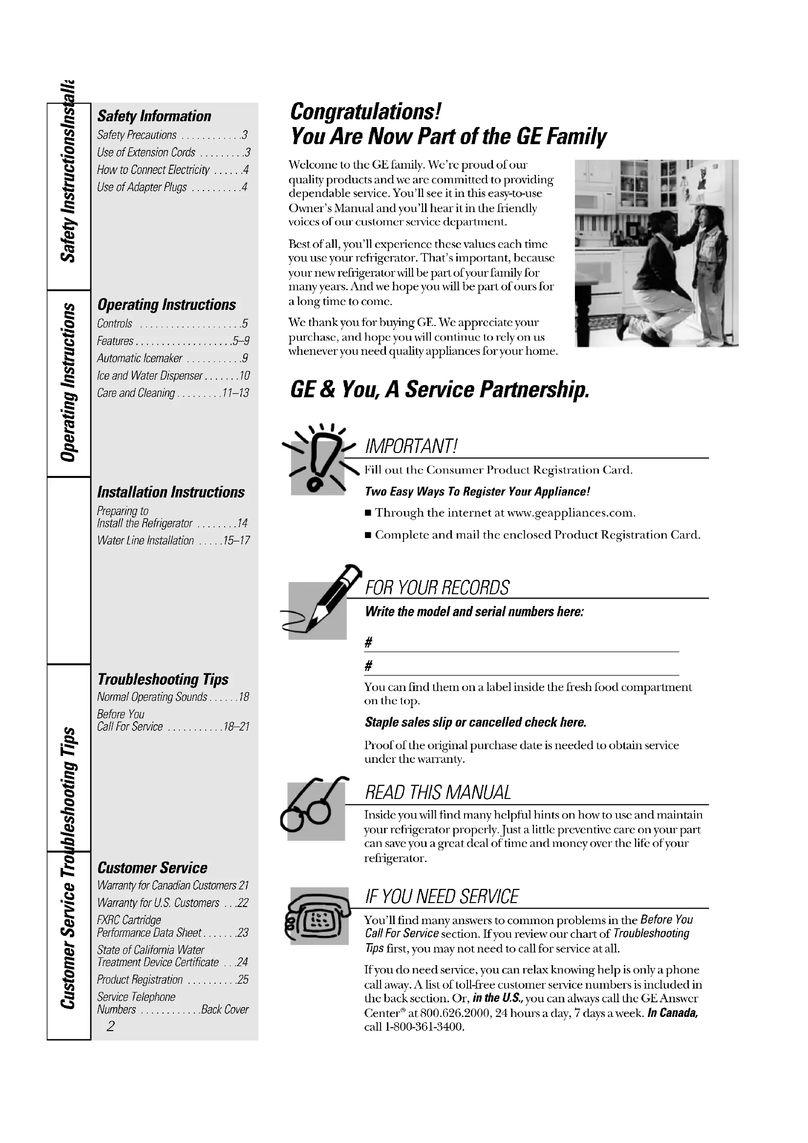 In the U.S.: 800.626.2000 The GE Answer Center® is open 24 hours a day, 7 days a week. In Canada, contact: Manager, Consumer Relations, Camco Inc., Suite 310, 1 Factory Lane,Moncton, N.B. E1C 9M3. In-Home Repair Service In the U.S.: 800-432-2737 Expert GE repair service is only a phone call away. In Canada, call 1-800-361-3400. Special Needs Service In the U.S.: 800.626.2000 GE offers, free of charge, a brochure to assist in planning a barrier-free kitchen for persons with limited mobility. In the U.S., call 800-TDD-GEAC (800-833-4322). In Canada, contact: Manager, Consumer Relations, Camco Inc., Suite 310, 1 Factory Lane,Moncton, N.B. E1C 9M3. Service Contracts In the U.S.: 800-626-2224 Purchase a GE service contract while your warranty is still in effect and you’ll receive a substantial discount. GE Consumer Service will still be there after your warranty expires. In Canada, call 1-800-461-3636. Parts and Accessories* In the U.S.: 800-626-2002 Individuals qualified to service their own appliances can have parts or accessories(*includingwater filters) sent directly to their homes (VISA, MasterCard and Discover cards are accepted). Instructions contained in this manual cover procedures to be performed by any user. Other servicinggenerally should be referred to qualified service personnel. Caution must be exercised, sinceimproper servicing may cause unsafe operation. Customers in Canada should consult the yellow pages for the nearest Camco service center, or call 1-800-361-3400. Service Satisfaction If you are not satisfied with the service you receive from GE: First, contact the people who serviced your appliance. Next, if you are still not pleased, in the U.S., write all the details—including your phone number—to: Manager, Consumer Relations, GE Appliances, Appliance Park, Louisville, KY 40225; or, in Canada, to Director, Consumer Relations, Camco Inc., Suite 310, 1 Factory Lane, Moncton,N.B. E1C 9M3.Printed in the United States