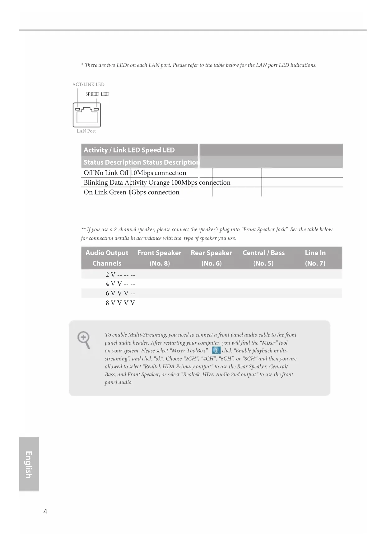 - ere are two LEDs on each LAN port. Please refer to the table below for the LAN port LED indications. Activity / Link LED Speed LED Status Description Status Description O No Link O 10Mbps connection Blinking Data Activity Orange 100Mbps connection On Link Green 1Gbps connection ** If you use a 2-channel speaker, please connect the speaker’s plug into “Front Speaker Jack”. See the table below for connection details in accordance with the type of speaker you use. Audio Output Channels Front Speaker (No. 8) Rear Speaker (No. 6) Central / Bass (No. 5) Line In (No. 7) 2 V -- -- -- 4 V V -- -- 6 V V V -- 8 V V V V To enable Multi-Streaming, you need to connect a front panel audio cable to the front panel audio header. Aer restarting your computer, you will nd the “Mixer” tool on your system. Please select “Mixer ToolBox” , click “Enable playback multi- streaming”, and click “ok”. Choose “2CH”, “4CH”, “6CH”, or “8CH” and then you are allowed to select “Realtek HDA Primary output” to use the Rear Speaker, Central/ Bass, and Front Speaker, or select “Realtek HDA Audio 2nd output” to use the front panel audio.