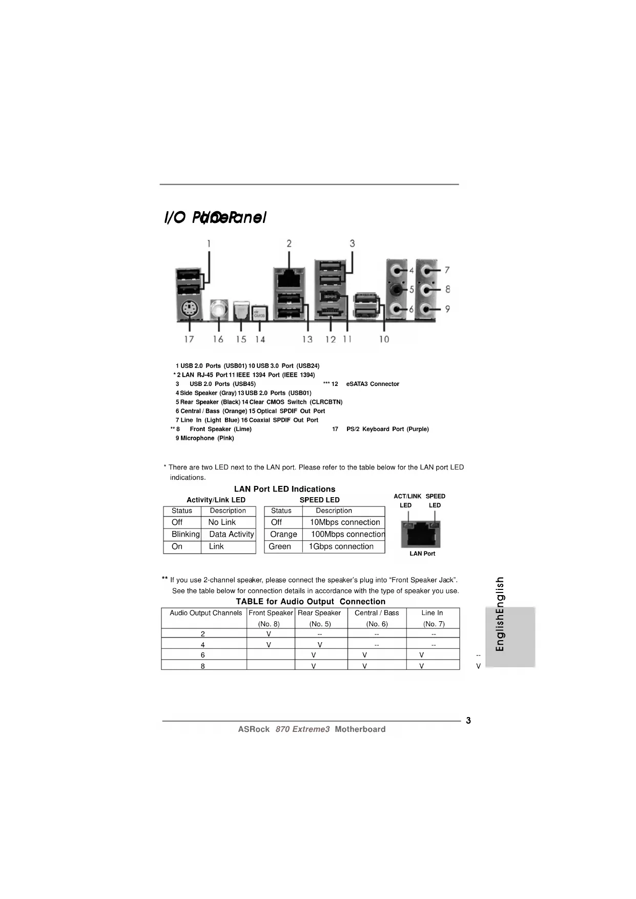 ASRock 870 Extreme3 Motherboard EnglishEnglish EnglishEnglish English - 1 x RJ-45 LAN Port with LED (ACT/LINK LED and SPEED LED) - 1 x IEEE 1394 Port - 1 x Clear CMOS Switch with LED - HD Audio Jack: Side Speaker/Rear Speaker/Central/Bass/ Line in/Front Speaker/Microphone (see CAUTION 6) SATA3 - 5 x SATA3 6.0 Gb/s connectors, support RAID (RAID 0, RAID 1, RAID 0+1 and RAID 5), NCQ, AHCI and "Hot Plug" functions USB 3.0 - 2 x USB 3.0 port by Etron EJ168A, support USB 1.0/2.0/