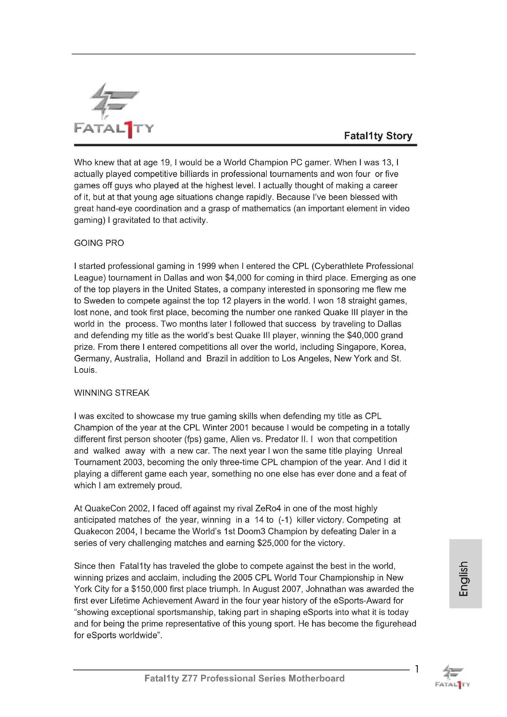 English Who knew that at age 19, I would be a World Champion PC gamer. When I was 13, I actually played competitive billiards in professional tournaments and won four or five games off guys who played at the highest level. I actually thought of making a career of it, but at that young age situations change rapidly. Because I’ve been blessed with great hand-eye coordination and a grasp of mathematics (an important element in video gaming) I gravitated to that activity. GOING PRO I started professional gaming in 1999 when I entered the CPL (Cyberathlete Professional League) tournament in Dallas and won $4,000 for coming in third place. Emerging as one of the top players in the United States, a company interested in sponsoring me ew me to Sweden to compete against the top 12 players in the world. I won 18 straight games, lost none, and took rst place, becoming the number one ranked Quake III player in the world in the process. Two months later I followed that success by traveling to Dallas and defending my title as the world’s best Quake III player, winning the $40,000 grand prize. From there I entered competitions all over the world, including Singapore, Korea, Germany, Australia, Holland and Brazil in addition to Los Angeles, New York and St. Louis. WINNING STREAK I was excited to showcase my true gaming skills when defending my title as CPL Champion of the year at the CPL Winter 2001 because I would be competing in a totally different first person shooter (fps) game, Alien vs. Predator II. I won that competition and walked away with a new car. The next year I won the same title playing Unreal Tournament 2003, becoming the only three-time CPL champion of the year. And I did it playing a different game each year, something no one else has ever done and a feat of which I am extremely proud. At QuakeCon 2002, I faced off against my rival ZeRo4 in one of the most highly anticipated matches of the year, winning in a 14 to (-1) killer victory. Competing at Quakecon 2004, I became the World’s 1st Doom3 Champion by defeating Daler in a series of very challenging matches and earning $25,000 for the victory. Since then Fatal1ty has traveled the globe to compete against the best in the world, winning prizes and acclaim, including the 2005 CPL World Tour Championship in New York City for a $150,000 rst place triumph. In August 2007, Johnathan was awarded the rst ever Lifetime Achievement Award in the four year history of the eSports-Award for “showing exceptional sportsmanship, taking part in shaping eSports into what it is today and for being the prime representative of this young sport. He has become the gurehead for eSports worldwide”. Fatal1ty Story2 Fatal1ty Z77 Professional Series Motherboard English LIVIN’ LARGE Since my rst big tournament wins, I have been a “Professional Cyberathlete”, traveling the world and livin’ large with lots of International media coverage on outlets such as MTV, ESPN and a 60 Minutes segment on CBS to name only a few. It's unreal - it's crazy. I’m living a dream by playing video games for a living. I’ve always been athletic and took sports like hockey and football very seriously, working out and training hard. This discipline helps me become a better gamer and my drive to be the best has opened the doors necessary to become a professional. A DREAM Now, another dream is being realized – building the ultimate gaming computer, made up of the best parts under my own brand. Quality hardware makes a huge difference in competitions…a couple more frames per second and everything gets really nice. It’s all about getting the computer processing faster and allowing more uid movement around the maps. My vision for Fatal1ty hardware is to allow gamers to focus on the game without worrying about their equipment, something I’ve preached since I began competing. I don’t want to worry about my equipment. I want to be there – over and done with - so I can focus on the game. I want it to be the fastest and most stable computer equipment on the face of the planet, so quality is what Fatal1ty Brand products represent. Johnathan “Fatal1ty” Wendel The Fatal1ty name, Fatal1ty logos and the Fatal1ty likeness are registered trademarks of Fatal1ty, Inc., and are used under license. © 2012 Fatal1ty, Inc. All rights reserved. All other trademarks are the property of their respective owners.3 English Copyright Notice: No part of this manual may be reproduced, transcribed, transmitted, or translated in any language, in any form or by any means, except duplication of documentation by the pur- chaser for backup purpose. Products and corporate names appearing in this manual may or may not be registered trademarks or copyrights of their respective companies, and are used only for identica- tion or explanation and to the owners’ benet, without intent to infringe. Disclaimer: Specications and information contained in this manual are furnished for informational use only and subject to change without notice, and should not be constructed as a com- mitment by us. We assumes no responsibility for any errors or omissions that may appear in this manual. With respect to the contents of this manual, We do not provide warranty of any kind, ei- ther expressed or implied, including but not limited to the implied warranties or conditions of merchantability or tness for a particular purpose. In no event shall we, its directors, ofcers, employees, or agents be liable for any indirect, special, incidental, or consequential damages (including damages for loss of prots, loss of business, loss of data, interruption of business and the like), even if we have been ad- vised of the possibility of such damages arising from any defect or error in the manual or product. This device complies with Part 15 of the FCC Rules. Operation is subject to the following two conditions: (1) this device may not cause harmful interference, and (2) this device must accept any interference received, inc
