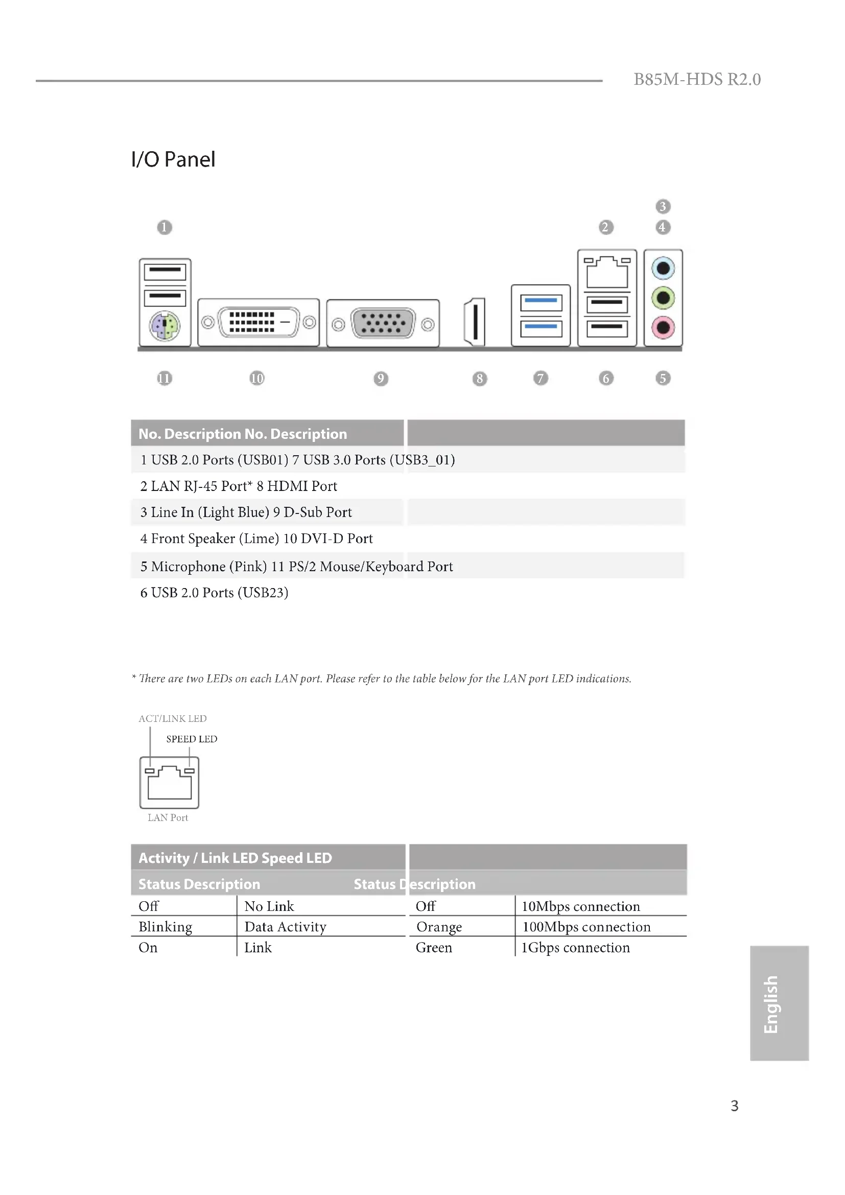 - ere are two LEDs on each LAN port. Please refer to the table below for the LAN port LED indications. Activity / Link LED Speed LED Status Description Status Description O No Link O 10Mbps connection Blinking Data Activity Orange 100Mbps connection On Link Green 1Gbps connection ACT/LINK LEDSPEED LEDLAN Port