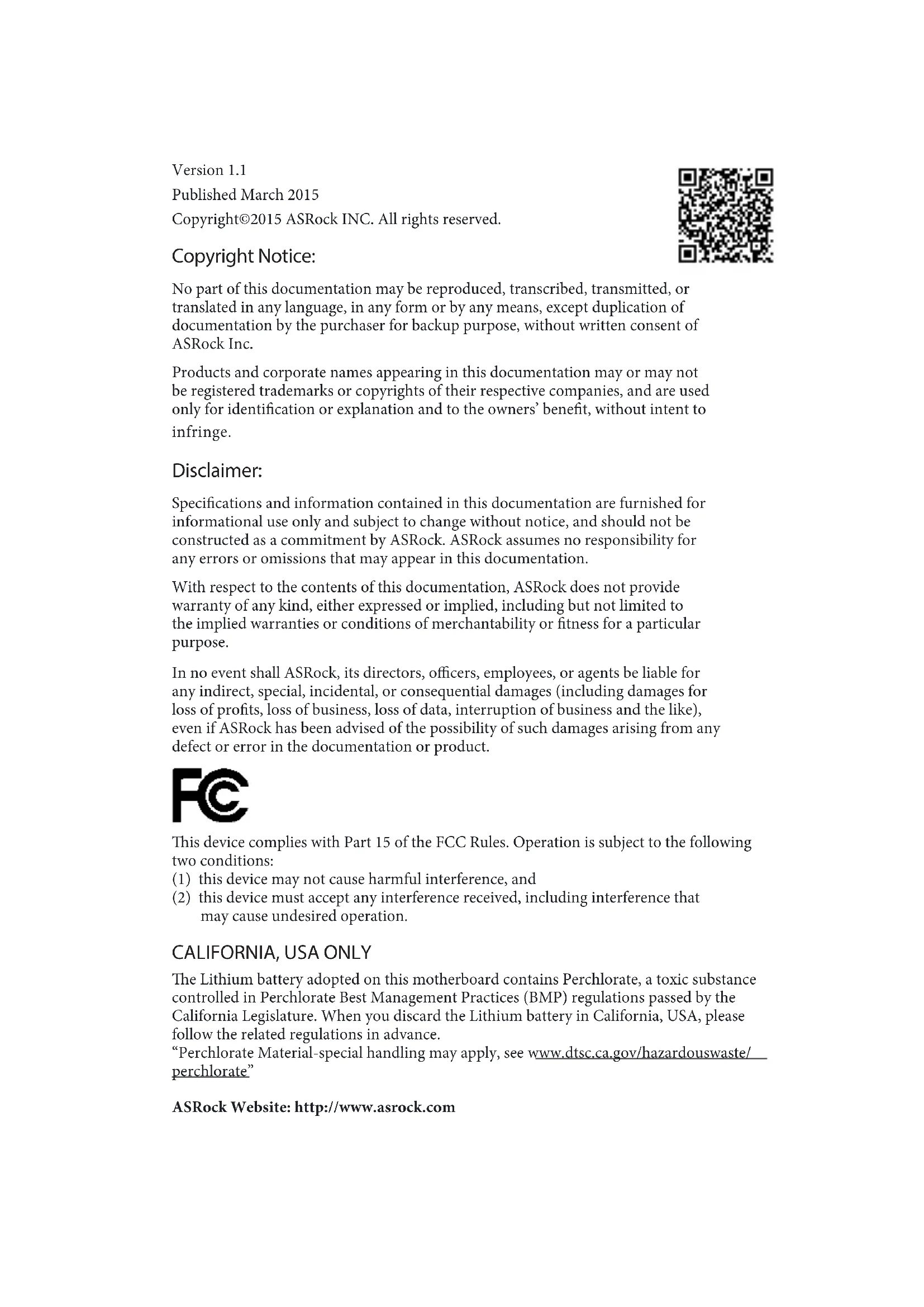 Version 1.1 Published March 2015 Copyright©2015 ASRock INC. All rights reserved. Copyright Notice: No part of this documentation may be reproduced, transcribed, transmitted, or translated in any language, in any form or by any means, except duplication of documentation by the purchaser for backup purpose, without written consent of ASRock Inc. Products and corporate names appearing in this documentation may or may not be registered trademarks or copyrights of their respective companies, and are used only for identication or explanation and to the owners’ benet, without intent to infringe. Disclaimer: Specications and information contained in this documentation are furnished for informational use only and subject to change without notice, and should not be constructed as a commitment by ASRock. ASRock assumes no responsibility for any errors or omissions that may appear in this documentation. With respect to the contents of this documentation, ASRock does not provide warranty of any kind, either expressed or implied, including but not limited to the implied warranties or conditions of merchantability or tness for a particular purpose. In no event shall ASRock, its directors, ocers, employees, or agents be liable for any indirect, special, incidental, or consequential damages (including damages for loss of prots, loss of business, loss of data, interruption of business and the like), even if ASRock has been advised of the possibility of such damages arising from any defect or error in the documentation or product. is device complies with Part 15 of the FCC Rules. Operation is subject to the following two conditions: (1) this device may not cause harmful interference, and (2) this device must accept any interference received, including interference that may cause undesired operation.