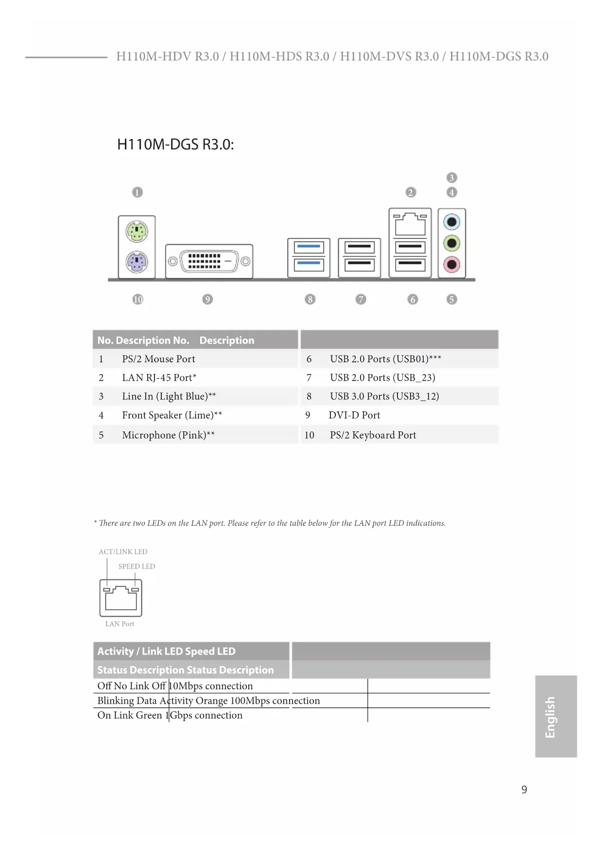 - ere are two LEDs on the LAN port. Please refer to the table below for the LAN port LED indications. Activity / Link LED Speed LED Status Description Status Description O No Link O 10Mbps connection Blinking Data Activity Orange 100Mbps connection On Link Green 1Gbps connection ACT/LINK LEDSPEED LEDLAN Port H110M-DGS R3.0: No. Description No. Description 1 PS/2 Mouse Port 6 USB 2.0 Ports (USB01)*** 2 LAN RJ-45 Port* 7 USB 2.0 Ports (USB_23) 3 Line In (Light Blue)** 8 USB 3.0 Ports (USB3_12) 4 Front Speaker (Lime)** 9 DVI-D Port 5 Microphone (Pink)** 10 PS/2 Keyboard Port