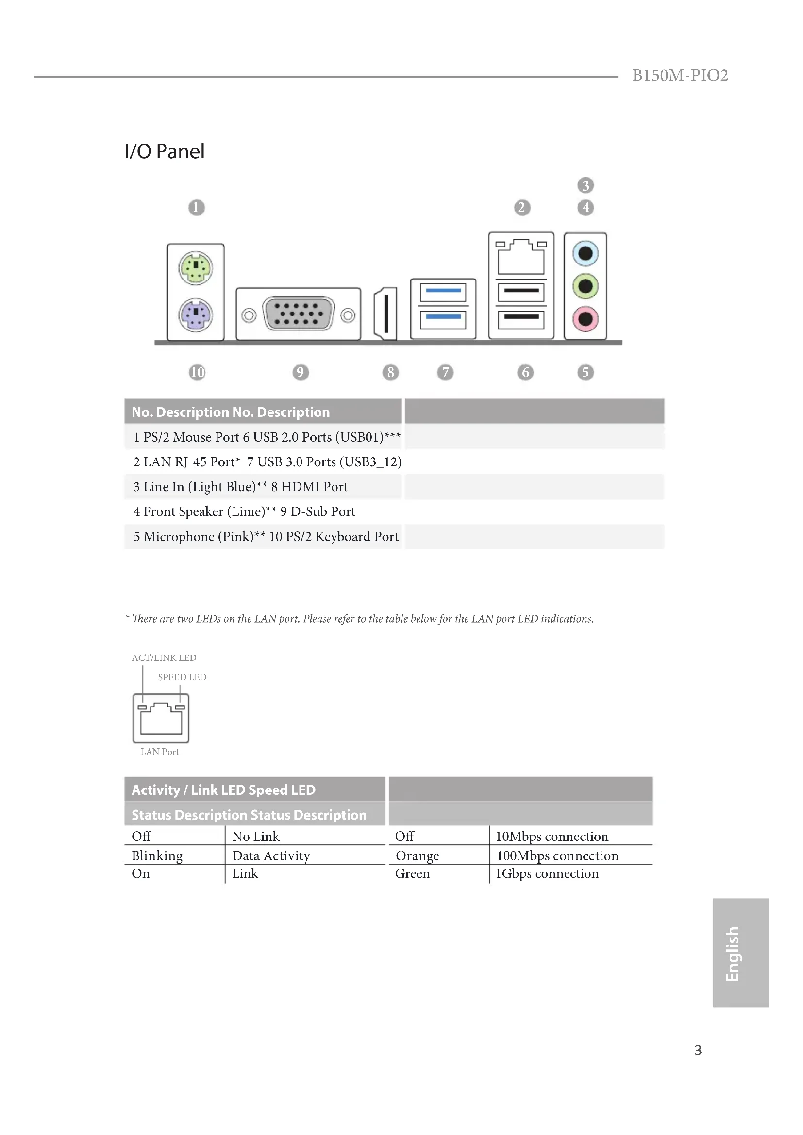 English ** To congure 7.1 CH HD Audio, it is required to use an HD front panel audio module and enable the multi- channel audio feature through the audio driver. Please set Speaker Conguration to “7.1 Speaker”in the Realtek HD Audio Manager. Function of the Audio Ports in 7.1-channel Conguration: Port Function Light Blue (Rear panel) Rear Speaker Out Lime (Rear panel) Front Speaker Out Pink (Rear panel) Central /Subwoofer Speaker Out Lime (Front panel) Side Speaker Out *** ACPI wake-up function is supported on USB01 ports only.5 English B150M-PIO2