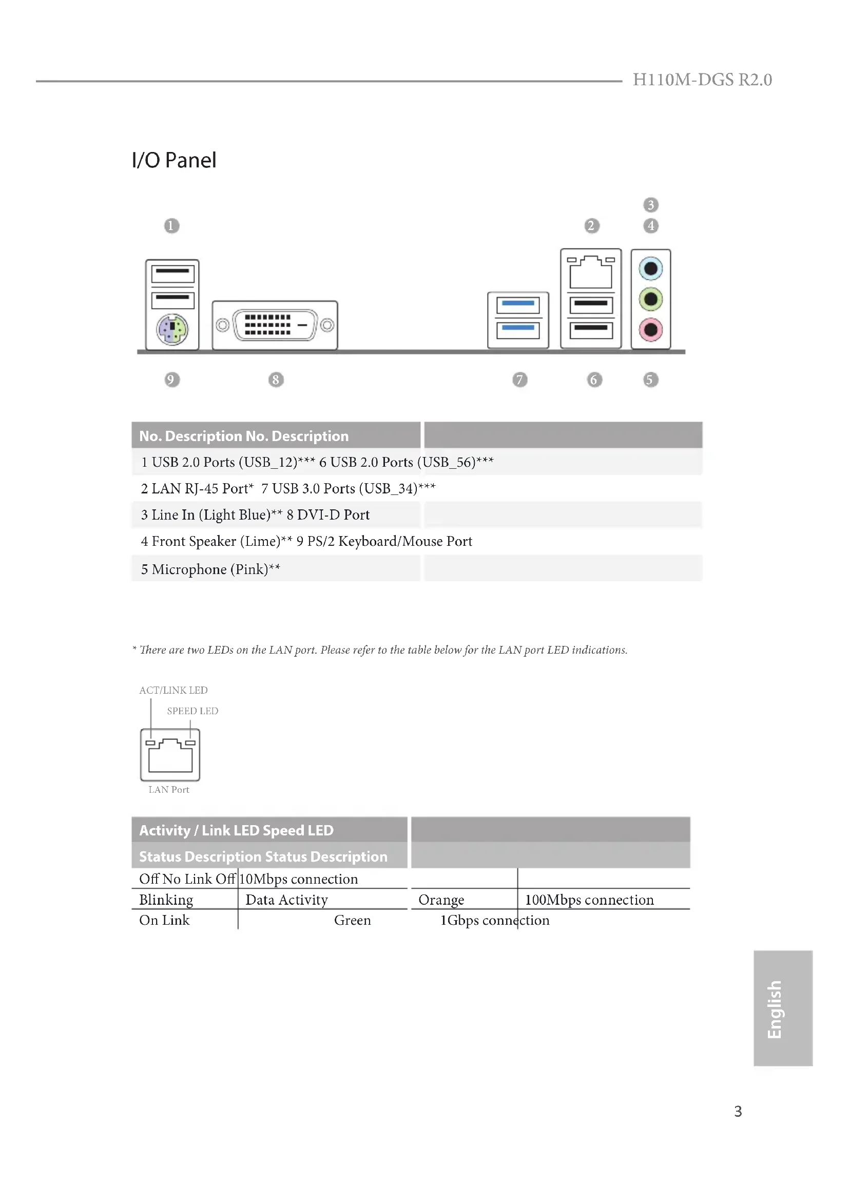 I/O Panel No. Description No. Description 1 USB 2.0 Ports (USB_12)*** 6 USB 2.0 Ports (USB_56)*** 2 LAN RJ-45 Port* 7 USB 3.0 Ports (USB_34)*** 3 Line In (Light Blue)** 8 DVI-D Port 4 Front Speaker (Lime)** 9 PS/2 Keyboard/Mouse Port 5 Microphone (Pink)**