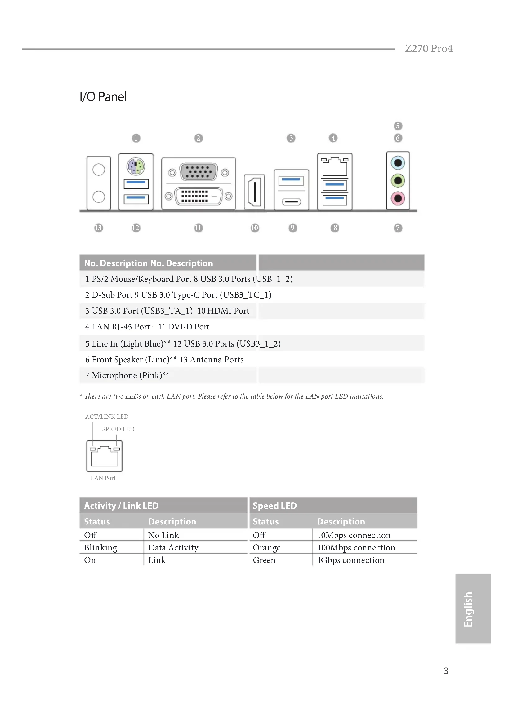 - ere are two LEDs on each LAN port. Please refer to the table below for the LAN port LED indications. Activity / Link LED Speed LED Status Description Status Description O No Link O 10Mbps connection Blinking Data Activity Orange 100Mbps connection On Link Green 1Gbps connection ACT/LINK LEDSPEED LEDLAN Port4 English ** To congure 7.1 CH HD Audio, it is required to use an HD front panel audio module and enable the multi- channel audio feature through the audio driver. Please set Speaker Conguration to “7.1 Speaker”in the Realtek HD Audio Manager. Function of the Audio Ports in 7.1-channel Conguration: Port Function Light Blue (Rear panel) Rear Speaker Out Lime (Rear panel) Front Speaker Out Pink (Rear panel) Central /Subwoofer Speaker Out Lime (Front panel) Side Speaker Out5 English Z270 Pro4