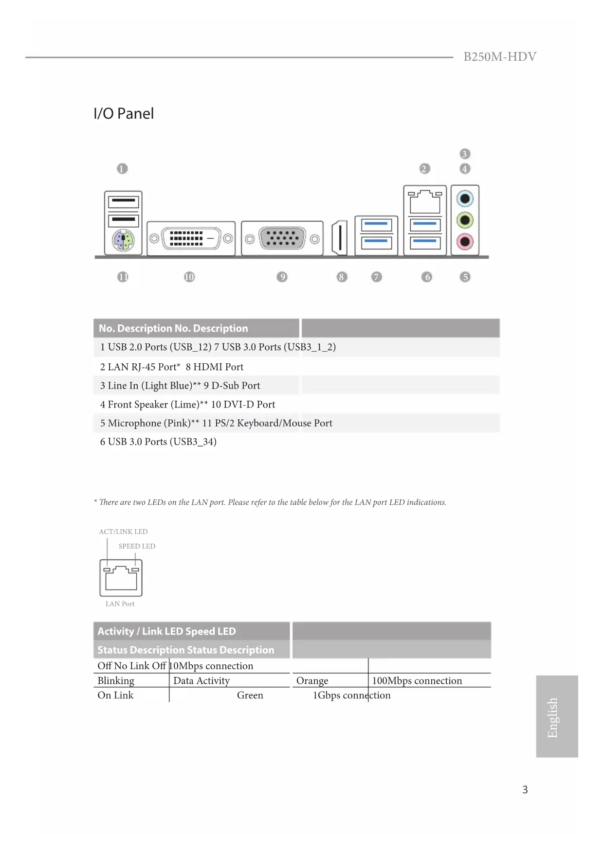 English ** To congure 7.1 CH HD Audio, it is required to use an HD front panel audio module and enable the multi-channel audio feature through the audio driver. Please set Speaker Conguration to “7.1 Speaker”in the Realtek HD Audio Manager. Function of the Audio Ports in 7.1-channel Conguration: Port Function Light Blue (Rear panel) Rear Speaker Out Lime (Rear panel) Front Speaker Out Pink (Rear panel) Central /Subwoofer Speaker Out Lime (Front panel) Side Speaker Out5 English B250M-HDV