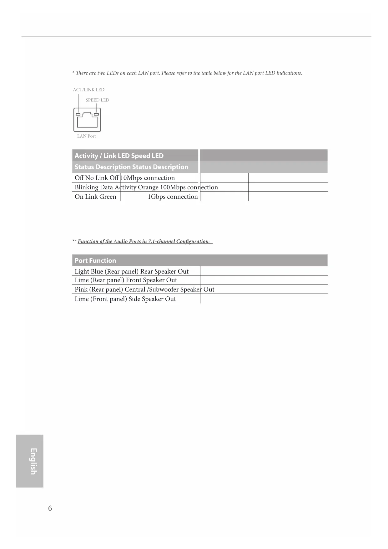 ** Function of the Audio Ports in 7.1-channel Conguration: Port Function Light Blue (Rear panel) Rear Speaker Out Lime (Rear panel) Front Speaker Out Pink (Rear panel) Central /Subwoofer Speaker Out Lime (Front panel) Side Speaker Out
