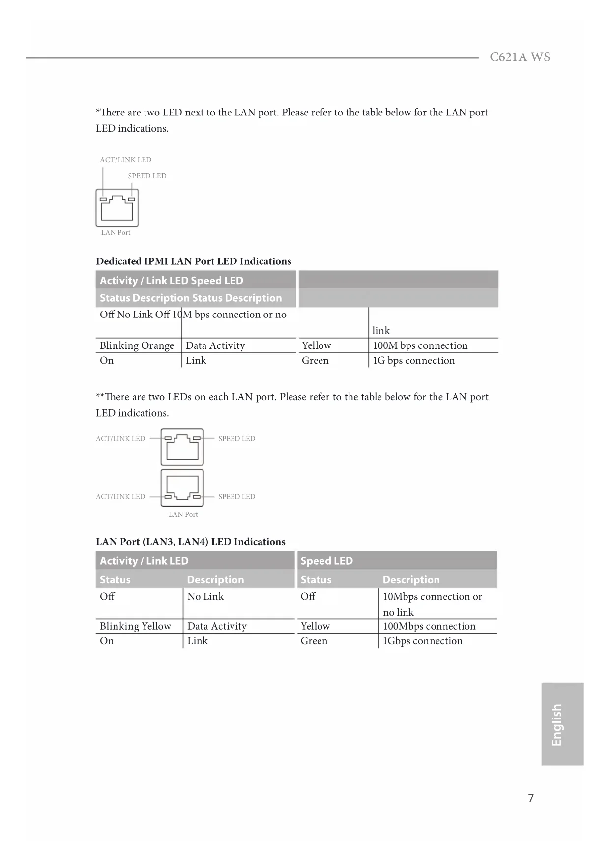 English *ere are two LED next to the LAN port. Please refer to the table below for the LAN port LED indications. Dedicated IPMI LAN Port LED Indications Activity / Link LED Speed LED Status Description Status Description O No Link O 10M bps connection or no link Blinking Orange Data Activity Yellow 100M bps connection On Link Green 1G bps connection **ere are two LEDs on each LAN port. Please refer to the table below for the LAN port LED indications. LAN Port (LAN3, LAN4) LED Indications Activity / Link LED Speed LED Status Description Status Description O No Link O 10Mbps connection or no link Blinking Yellow Data Activity Yellow 100Mbps connection On Link Green 1Gbps connection