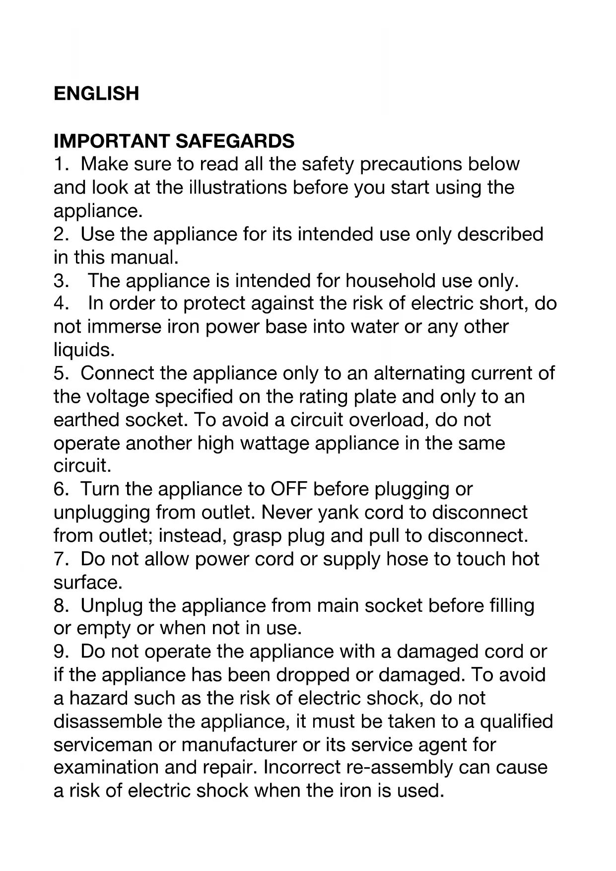if the appliance has been dropped or damaged. To avoid a hazard such as the risk of electric shock, do not disassemble the appliance, it must be taken to a qualified serviceman or manufacturer or its service agent for examination and repair. Incorrect re-assembly can cause a risk of electric shock when the iron is used.10. Place the iron out of reach of children; close supervision is necessary for any appliance being used by or near children. Do not leave the iron unattended while connected to the supply mains.