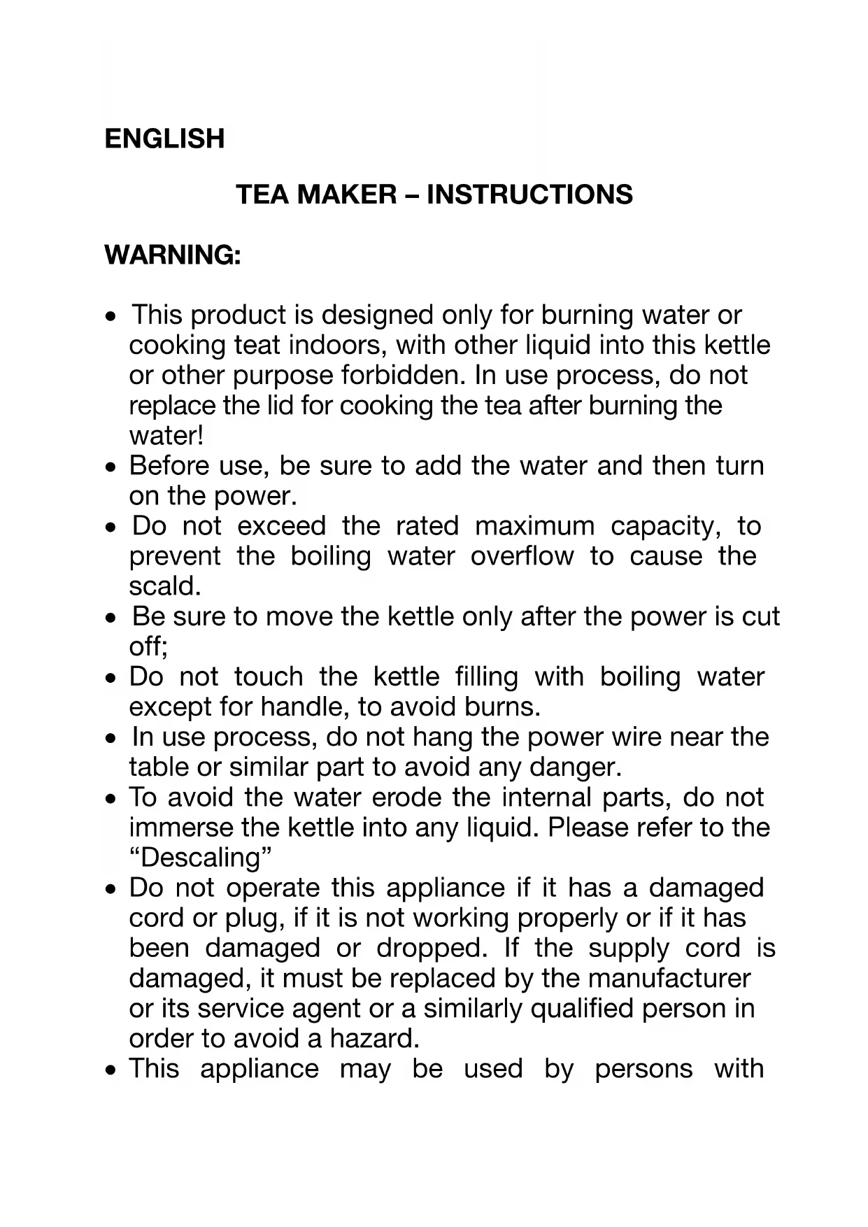 - To avoid the water erode the internal parts, do not immerse the kettle into any liquid. Please refer to the “Descaling”