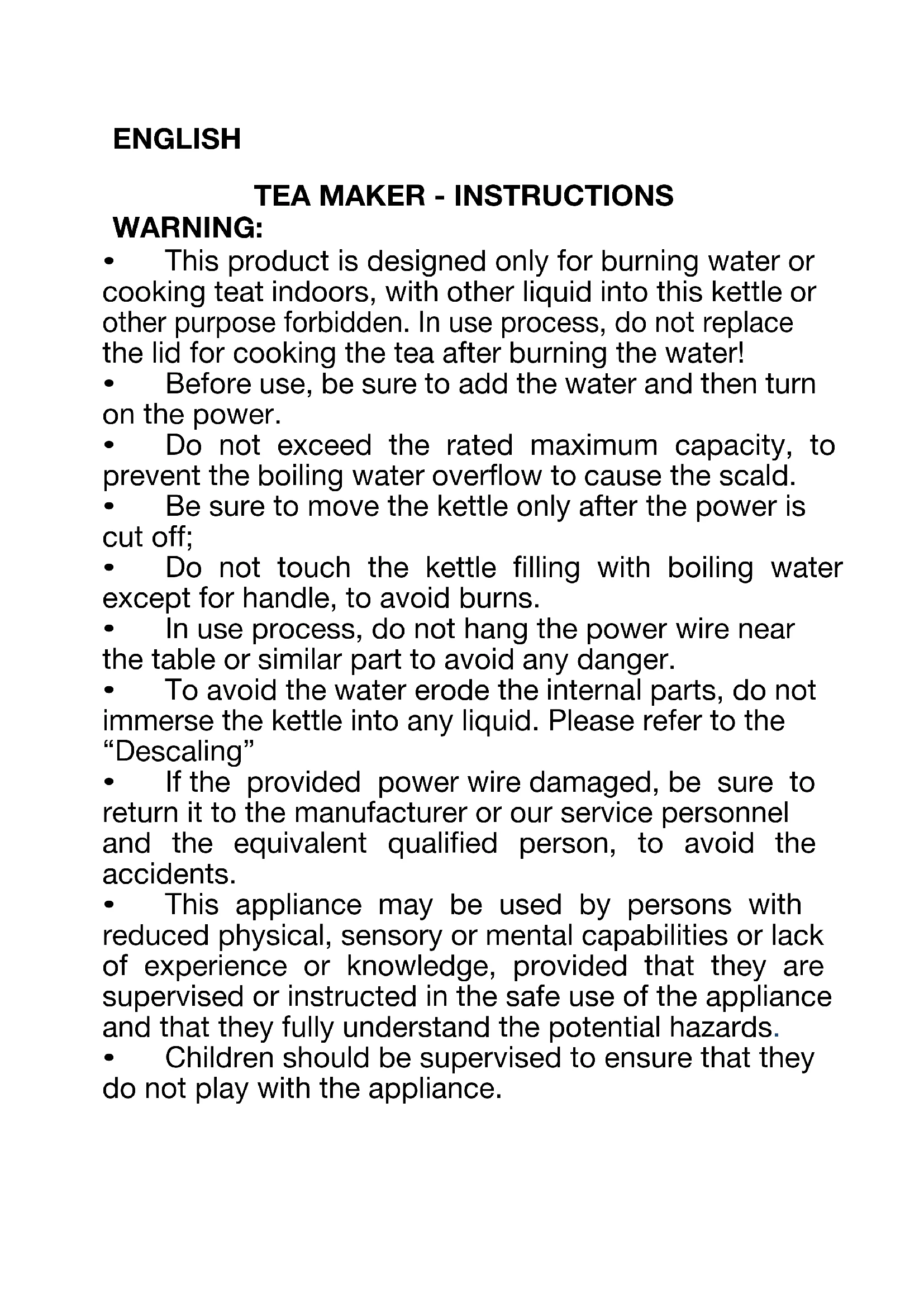 This product is designed only for burning water or cooking teat indoors, with other liquid into this kettle or other purpose forbidden. In use process, do not replace the lid for cooking the tea after burning the water!