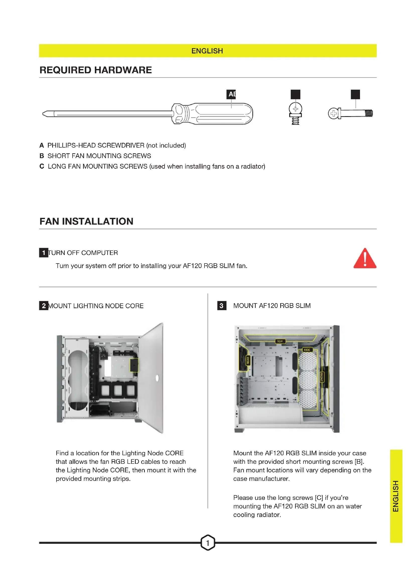 Turn your system off prior to installing your AF120 RGB SLIM fan. Mount the AF120 RGB SLIM inside your case with the provided short mounting screws [B]. Fan mount locations will vary depending on the case manufacturer. Please use the long screws [C] if you’re mounting the AF120 RGB SLIM on an water cooling radiator.