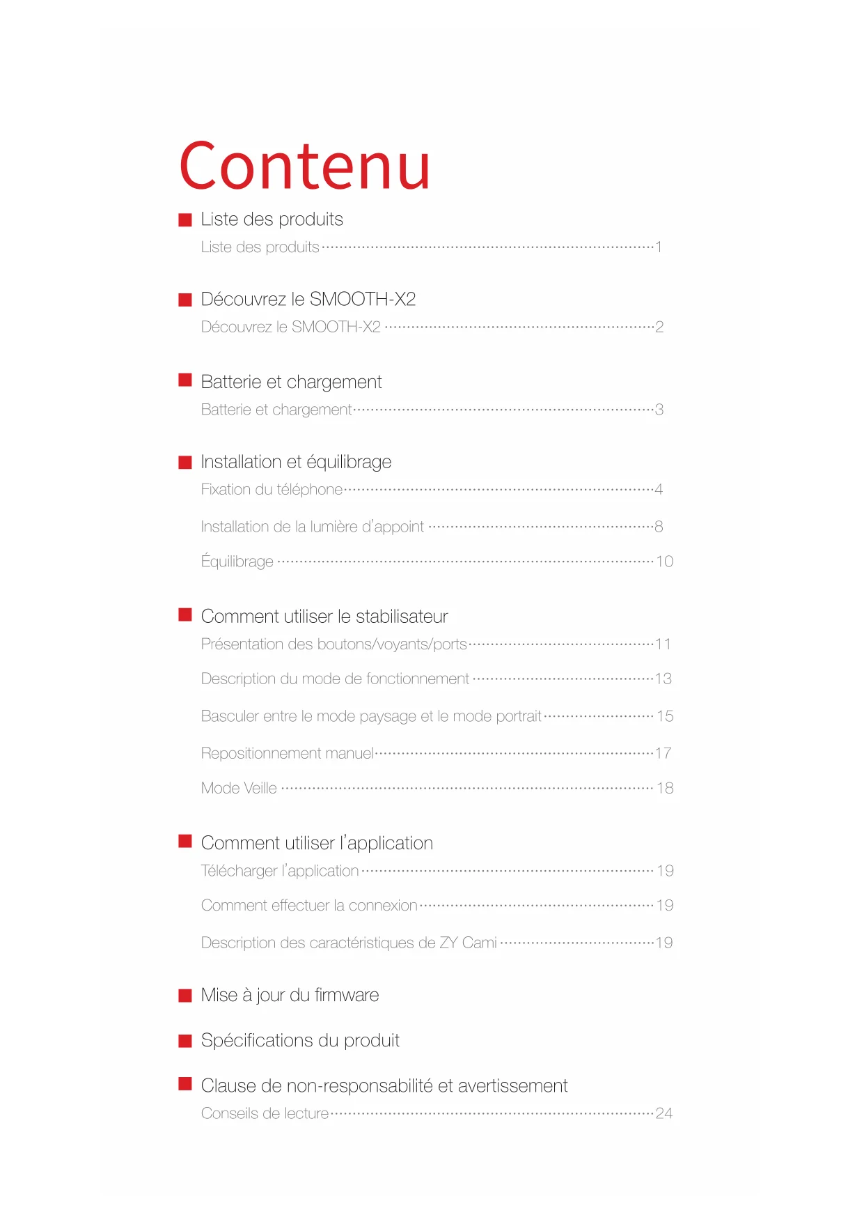 Comment utiliser le stabilisateur Présentation des boutons/voyants/ports ··········································11 Description du mode de fonctionnement ·········································13 Basculer entre le mode paysage et le mode portrait ························· 15 Repositionnement manuel ·······························································17 Mode Veille ····················································································18