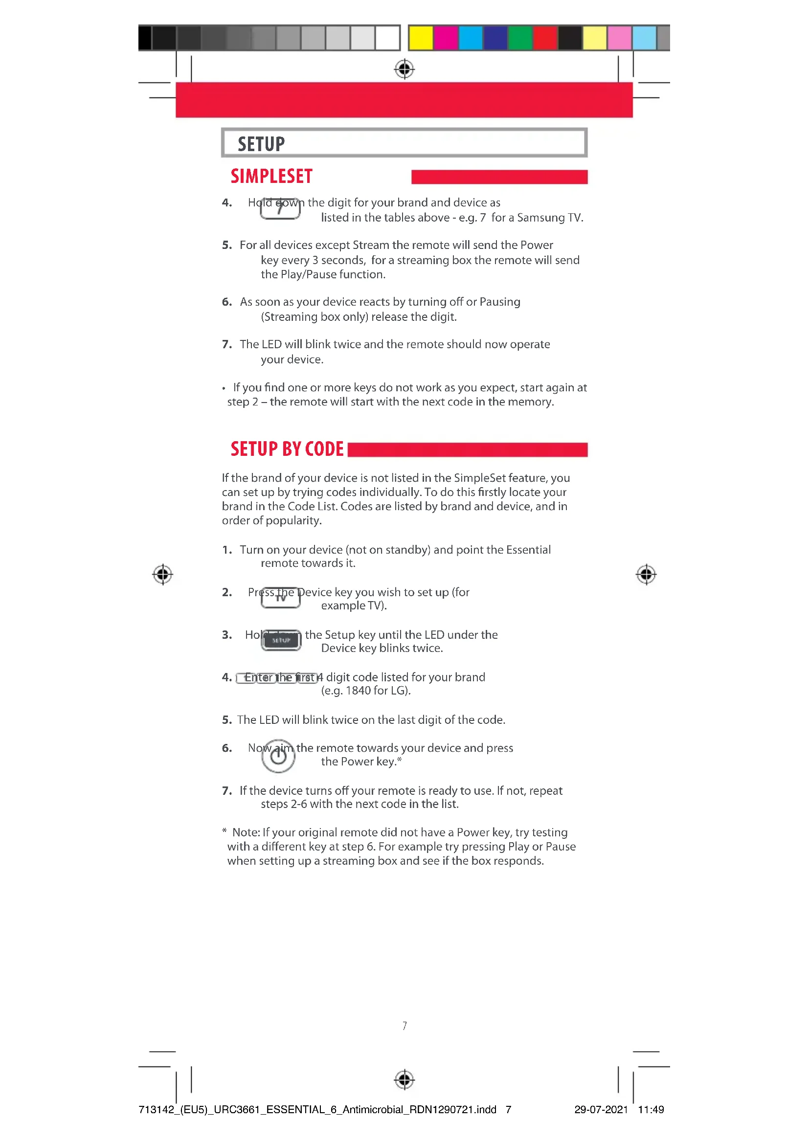 Backlight On / O Turns the backlight on or o. When on, any key press will activate the backlight for 10 seconds. Press this key to turn the backlight o and again to turn back on. KEY DESCRIPTIONS 713142_(EU5)_URC3661_ESSENTIAL_6_Antimicrobial_RDN1290721.indd 4713142_(EU5)_URC3661_ESSENTIAL_6_Antimicrobial_RDN1290721.indd 4 29-07-2021 11:4929-07-2021 11:495 The Essential 6 remote is pre-programmed to control some of the most popular devices out of the box. If you have one of the following devices try the putting the batteries in and pressing the device key, and then press a few keys to see if the remote works your device: Device Key To Press Device controlled TV Samsung TV STREAM Roku Streaming Box STB Sky Q Box (UK and Italy only) AUDIO Onkyo Receiver BLURAY Samsung Blu-ray Player DVD Sony DVD Player If your device is not one of those listed above, or you have extra devices to set up, there are 2 ways to do this. The easiest is SimpleSet which is used for the common brands and devices. If the brand of your device is shown in the SimpleSet picture pointing to a key, you can use the SimpleSet system described in this section, please locate the brand of your device and note the key associated with it.