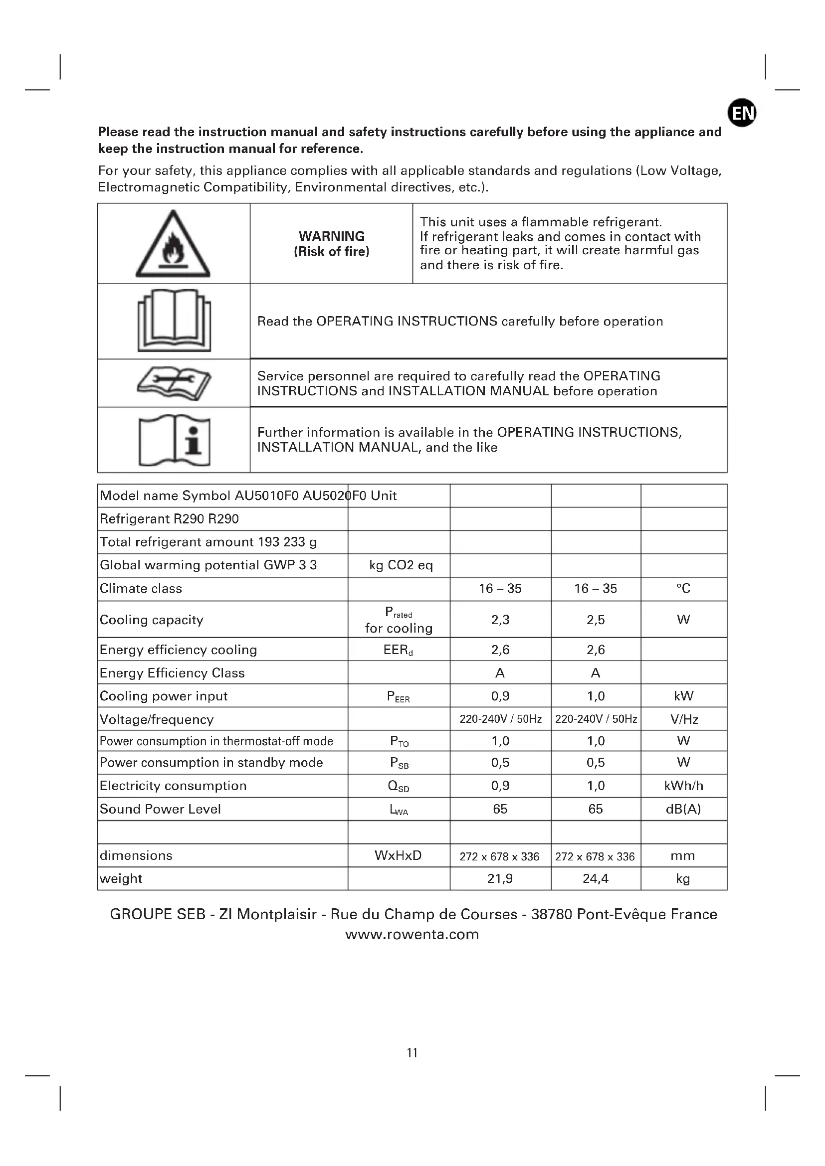 Please read the instruction manual and safety instructions carefully before using the appliance and keep the instruction manual for reference. For your safety, this appliance complies with all applicable standards and regulations (Low Voltage, Electromagnetic Compatibility, Environmental directives, etc.). WARNING (Risk of fire) This unit uses a flammable refrigerant. If refrigerant leaks and comes in contact with fire or heating part, it will create harmful gas and there is risk of fire. Read the OPERATING INSTRUCTIONS carefully before operation Service personnel are required to carefully read the OPERATING INSTRUCTIONS and INSTALLATION MANUAL before operation Further information is available in the OPERATING INSTRUCTIONS, INSTALLATION MANUAL, and the like Model name Symbol AU5010F0 AU5020F0 Unit Refrigerant R290 R290 Total refrigerant amount 193 233 g Global warming potential GWP 3 3 kg CO2 eq Climate class 16 – 35 16 – 35 °C Cooling capacity