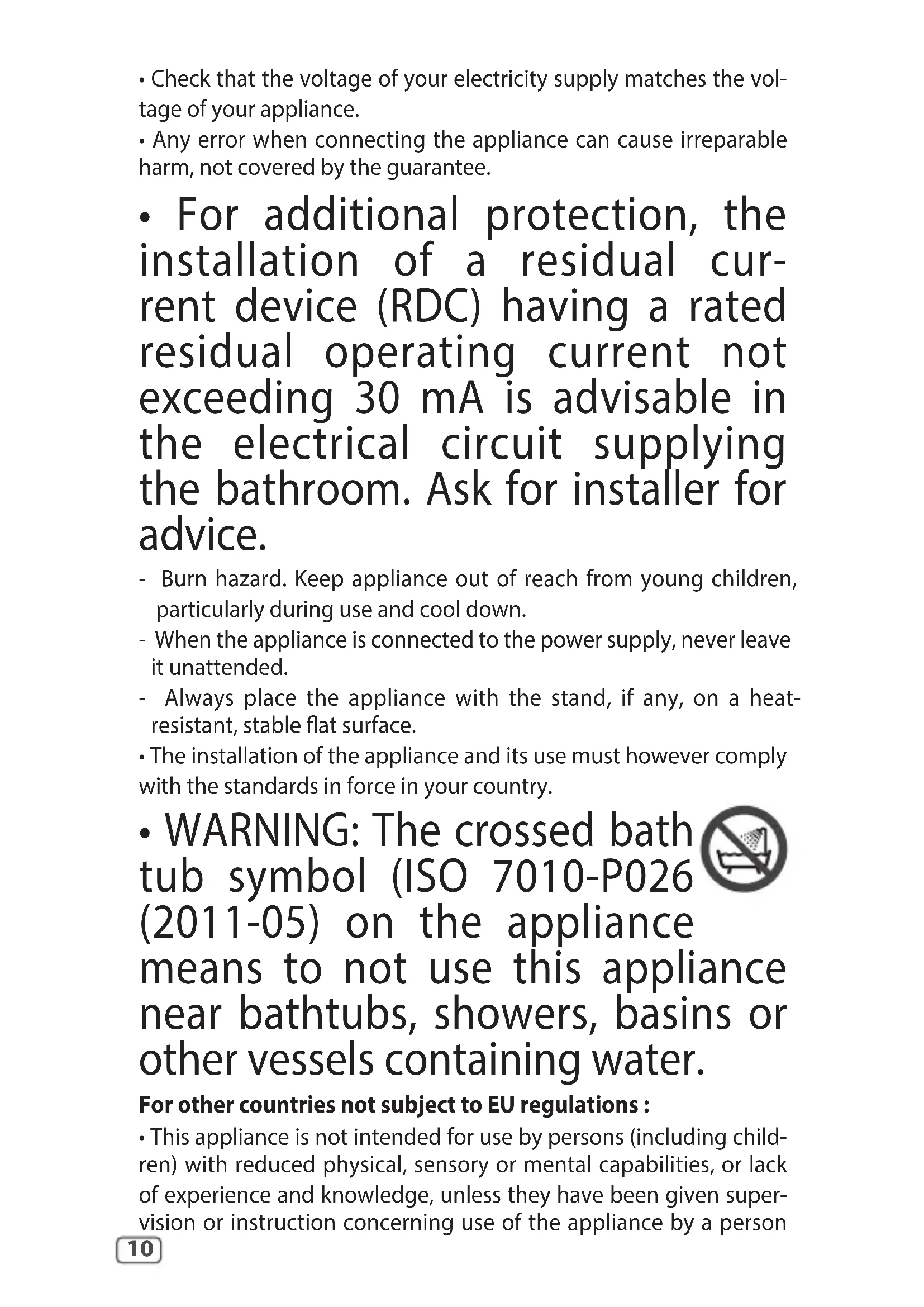 - WARNING: The crossed bath tub symbol (ISO 7010-P026 (2011-05) on the appliance means to not use this appliance near bathtubs, showers, basins or other vessels containing water. For other countries not subject to EU regulations :