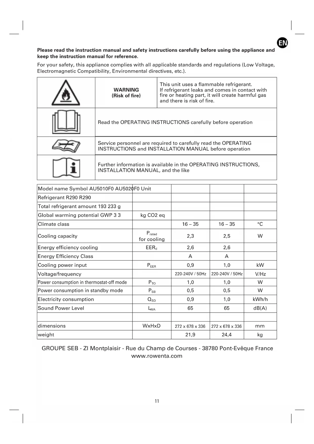 Please read the instruction manual and safety instructions carefully before using the appliance and keep the instruction manual for reference. For your safety, this appliance complies with all applicable standards and regulations (Low Voltage, Electromagnetic Compatibility, Environmental directives, etc.). WARNING (Risk of fire) This unit uses a flammable refrigerant. If refrigerant leaks and comes in contact with fire or heating part, it will create harmful gas and there is risk of fire. Read the OPERATING INSTRUCTIONS carefully before operation Service personnel are required to carefully read the OPERATING INSTRUCTIONS and INSTALLATION MANUAL before operation Further information is available in the OPERATING INSTRUCTIONS, INSTALLATION MANUAL, and the like Model name Symbol AU5010F0 AU5020F0 Unit Refrigerant R290 R290 Total refrigerant amount 193 233 g Global warming potential GWP 3 3 kg CO2 eq Climate class 16 – 35 16 – 35 °C Cooling capacity