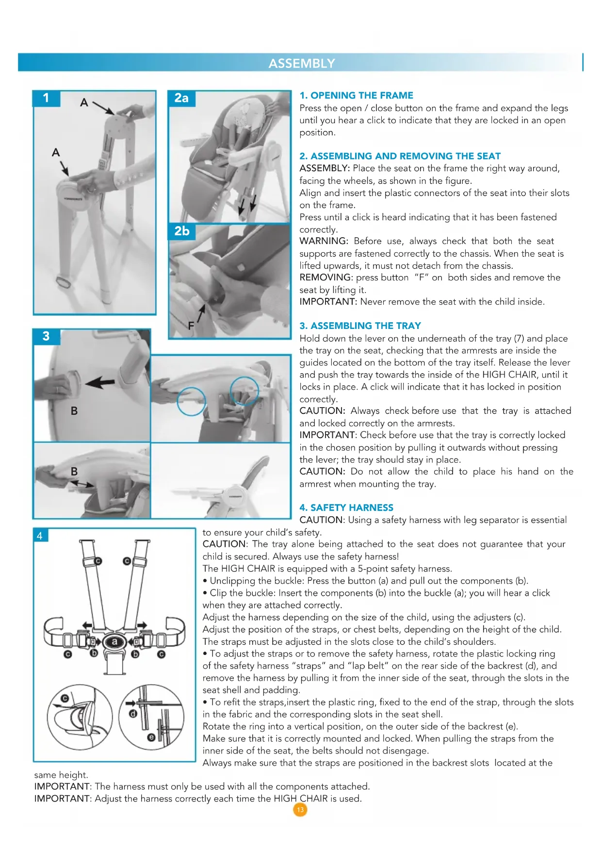 - To ret the straps,insert the plastic ring, xed to the end of the strap, through the slots in the fabric and the corresponding slots in the seat shell. Rotate the ring into a vertical position, on the outer side of the backrest (e). Make sure that it is correctly mounted and locked. When pulling the straps from the inner side of the seat, the belts should not disengage. Always make sure that the straps are positioned in the backrest slots located at the same height. IMPORTANT: The harness must only be used with all the components attached. IMPORTANT: Adjust the harness correctly each time the HIGH CHAIR is used. ASSEMBLY