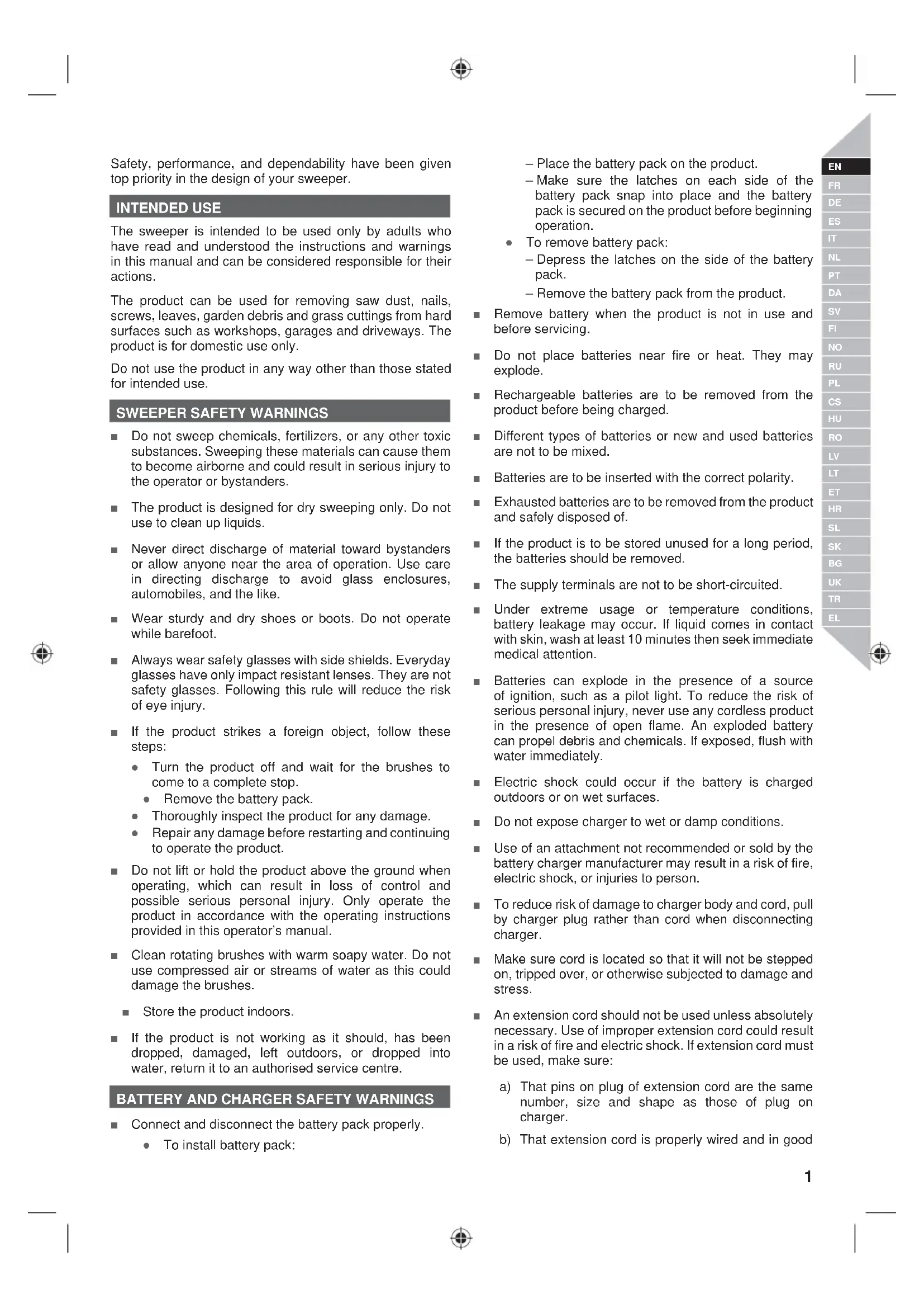 NXOODQPDGDQ |QFH EX NÕODYX]GDNL WDOLPDWODUÕ RNXPDQÕ] gerekmektedir. 7HNQLNGH÷LúLNOLNOHUHWDELGLU (/ȆȡȠıȠȤȒ ǾıȣıțİȣȒȝʌȠȡİȓȞĮȤȡȘıȚȝȠʌȠȚȘșİȓĮʌȩʌĮȚįȚȐȘȜȚțȓĮȢ İIJȫȞ țĮȚ ʌȐȞȦ țĮȚ ȐIJȠȝĮ ȝİ ȝİȚȦȝȑȞİȢ ıȦȝĮIJȚțȑȢ ĮȚıșȘIJȒȡȚİȢȒȞȠȘIJȚțȑȢȚțĮȞȩIJȘIJİȢȒȑȜȜİȚȥȘİȝʌİȚȡȓĮȢțĮȚ ȖȞȫıȘȢİij¶ȩıȠȞʌĮȡȑȤİIJĮȚİʌȓȕȜİȥȘȒȠįȘȖȓİȢȖȚĮIJȘȤȡȒıȘ IJȘȢıȣıțİȣȒȢȝİĮıijĮȜȒIJȡȩʌȠțĮȚIJĮȐIJȠȝĮțĮIJĮȞȠȠȪȞ IJȠȣȢİȝʌȜİțȩȝİȞȠȣȢțȚȞįȪȞȠȣȢȂȘȞĮijȒȞİIJİIJĮʌĮȚįȚȐȞĮ ʌĮȓȗȠȣȞȝİIJȘıȣıțİȣȒȅțĮșĮȡȚıȝȩȢțĮȚȘıȣȞIJȒȡȘıȘįİȞ ʌȡȑʌİȚȞĮʌĮȡȑȤȠȞIJĮȚĮʌȩʌĮȚįȚȐȤȦȡȓȢİʌȓȕȜİȥȘ ǻȚĮȕȐıIJİ IJȚȢ ȠįȘȖȓİȢ ıIJȠ ʌĮȡȩȞ İȖȤİȚȡȓįȚȠ ʌȡȚȞ ıȣȞĮȡȝȠȜȠȖȒıİIJİ ȤȡȘıȚȝȠʌȠȚȒıİIJİ țĮȚ ıȣȞIJȘȡȒıİIJİ IJȠ ȝȘȤȐȞȘȝĮ ȊʌȩțİȚIJĮȚıİIJİȤȞȚțȑȢIJȡȠʌȠʌȠȚȒıİȚȢSafety, performance, and dependability have been given top priority in the design of your sweeper. INTENDED USE The sweeper is intended to be used only by adults who have read and understood the instructions and warnings in this manual and can be considered responsible for their actions. The product can be used for removing saw dust, nails, screws, leaves, garden debris and grass cuttings from hard surfaces such as workshops, garages and driveways. The product is for domestic use only. Do not use the product in any way other than those stated for intended use.