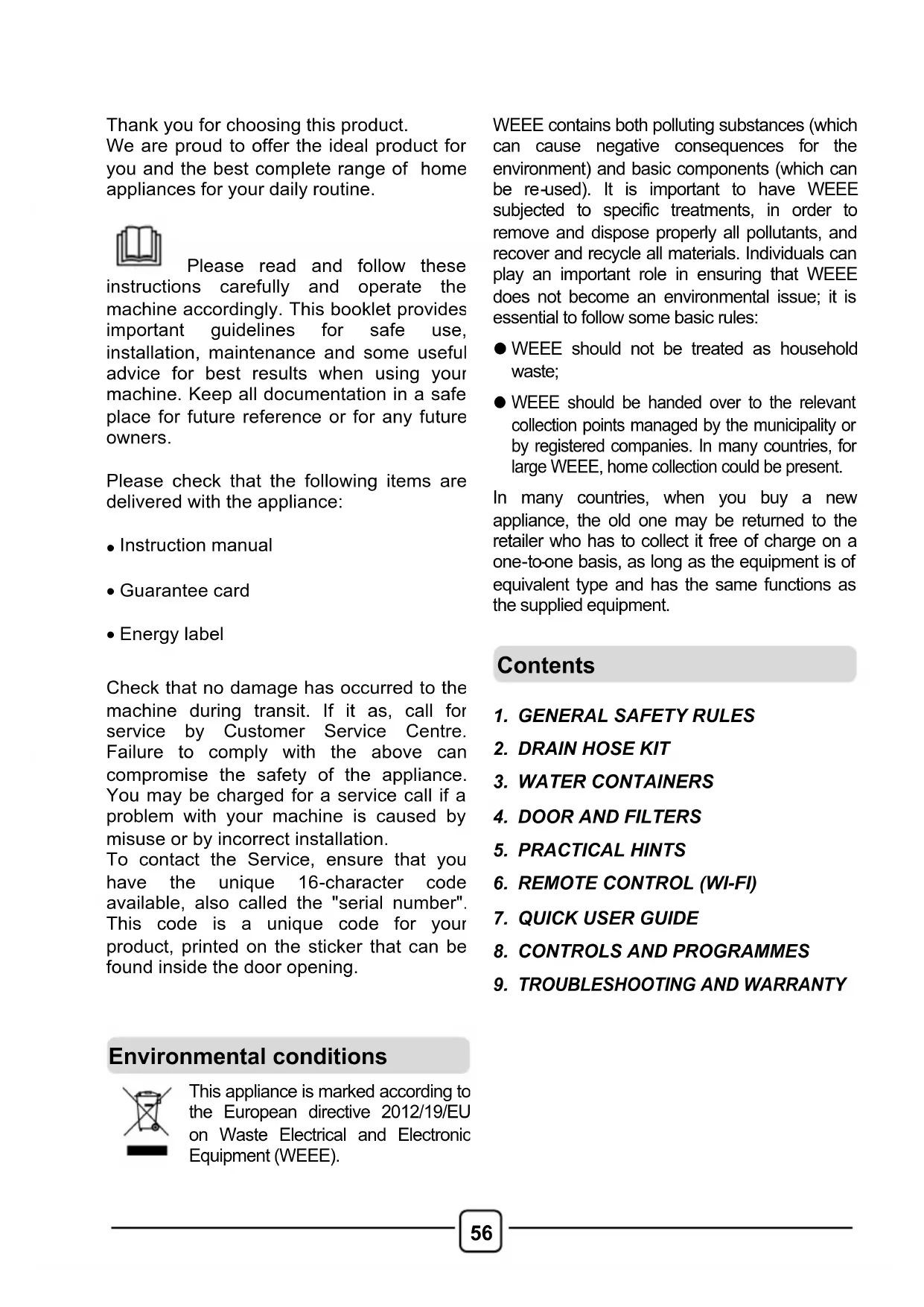 Please read and follow these instructions carefully and operate the machine accordingly. This booklet provides important guidelines for safe use, installation, maintenance and some useful advice for best results when using your machine. Keep all documentation in a safe place for future reference or for any future owners.