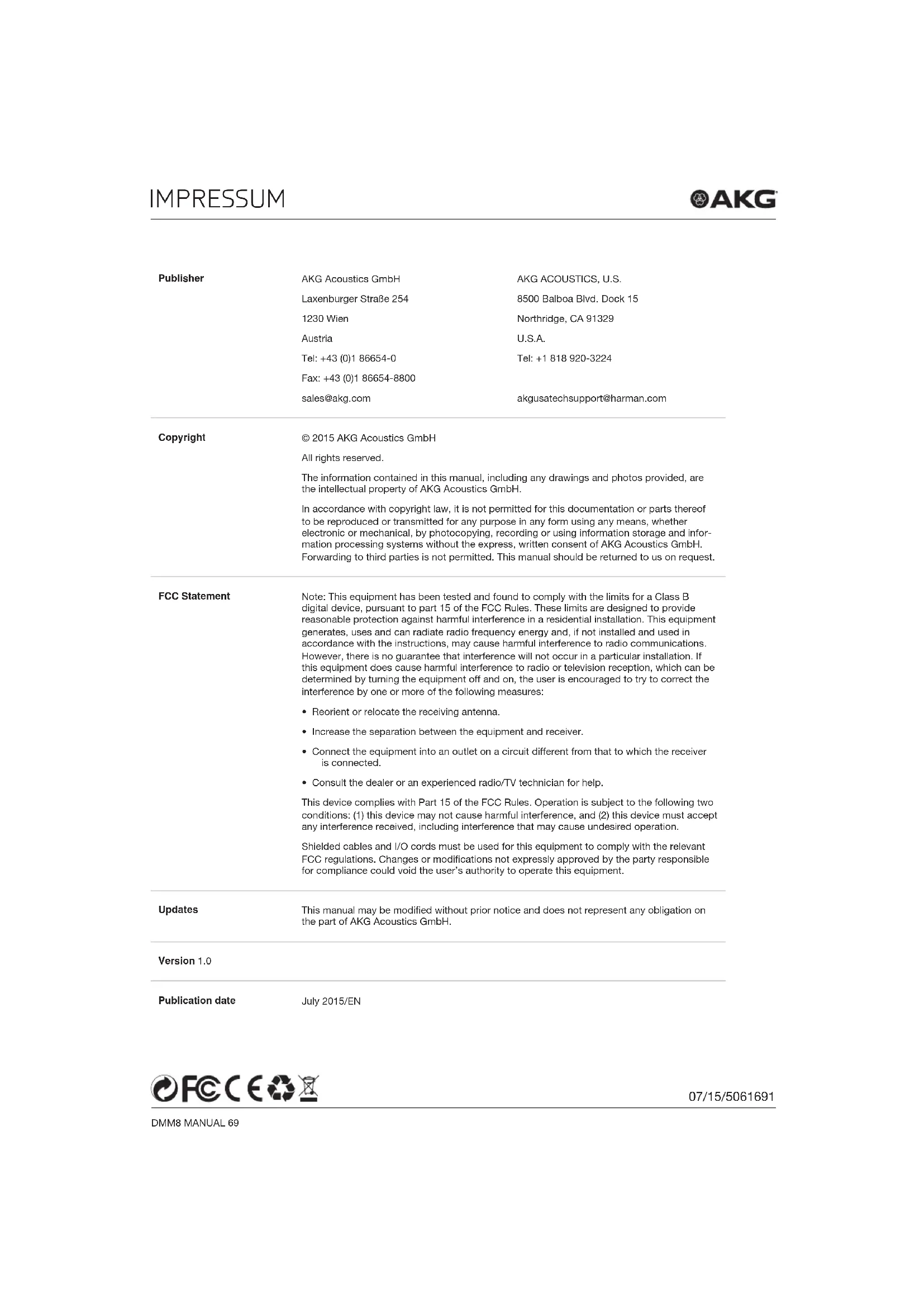 - Consult the dealer or an experienced radio/TV technician for help. This device complies with Part 15 of the FCC Rules. Operation is subject to the following two conditions: (1) this device may not cause harmful interference, and (2) this device must accept any interference received, including interference that may cause undesired operation. Shielded cables and I/O cords must be used for this equipment to comply with the relevant FCCregulations.Changesormodicationsnotexpresslyapprovedbythepartyresponsible for compliance could void the user’s authority to operate this equipment. Updates Thismanualmaybemodiedwithoutpriornoticeanddoesnotrepresentanyobligationon the part of AKG Acoustics GmbH. Version 1.0 Publication date July 2015/EN 07/15/5061691generAL DMM8 MANUAL 70 1 General