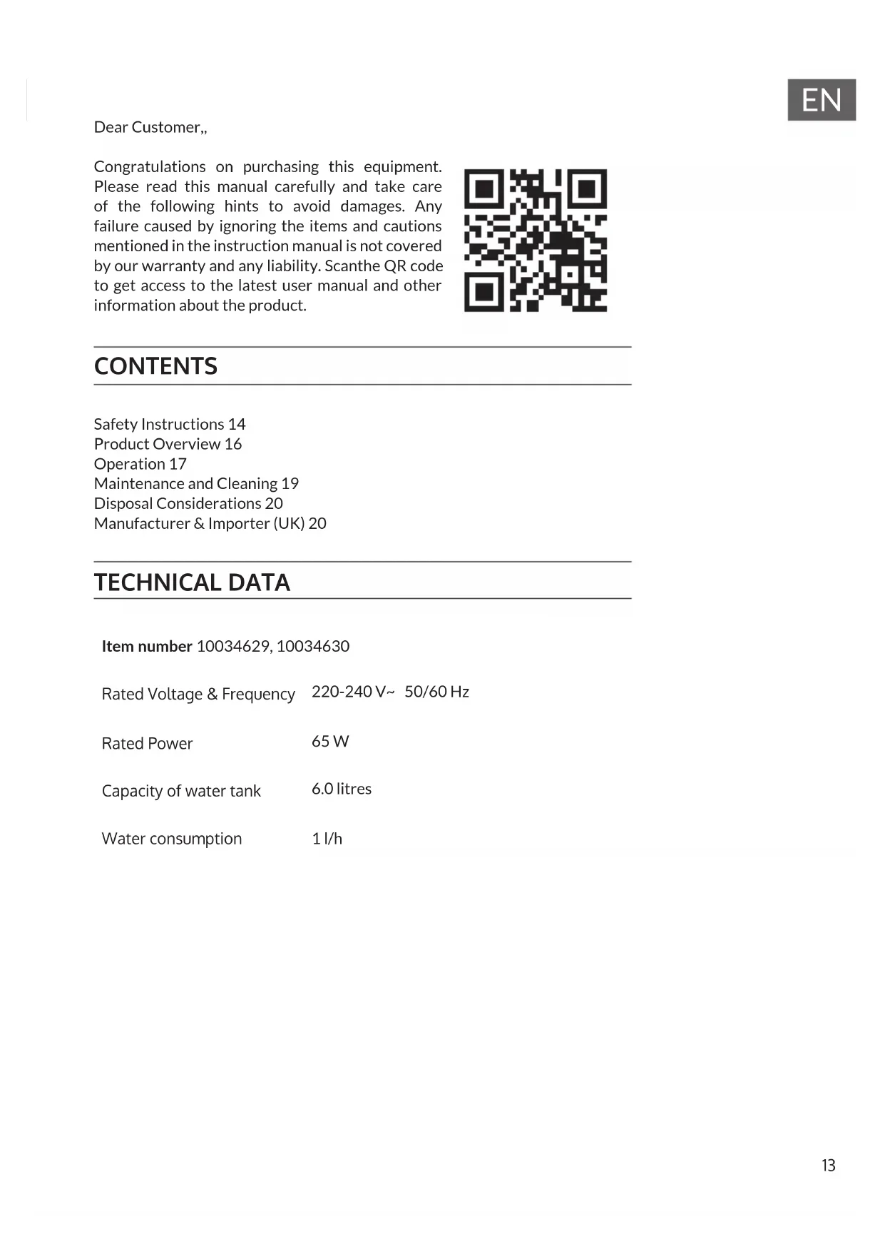 Dear Customer,, Congratulations on purchasing this equipment. Please read this manual carefully and take care of the following hints to avoid damages. Any failure caused by ignoring the items and cautions mentioned in the instruction manual is not covered by our warranty and any liability. Scanthe QR code to get access to the latest user manual and other information about the product. CONTENTS Safety Instructions 14 Product Overview 16 Operation 17 Maintenance and Cleaning 19 Disposal Considerations 20 Manufacturer & Importer (UK) 20 TECHNICAL DATA Item number 10034629, 10034630 Rated Voltage & Frequency 220-240V~ 50/60Hz Rated Power 65W Capacity of water tank 6.0litres Water consumption 1 l/h f14