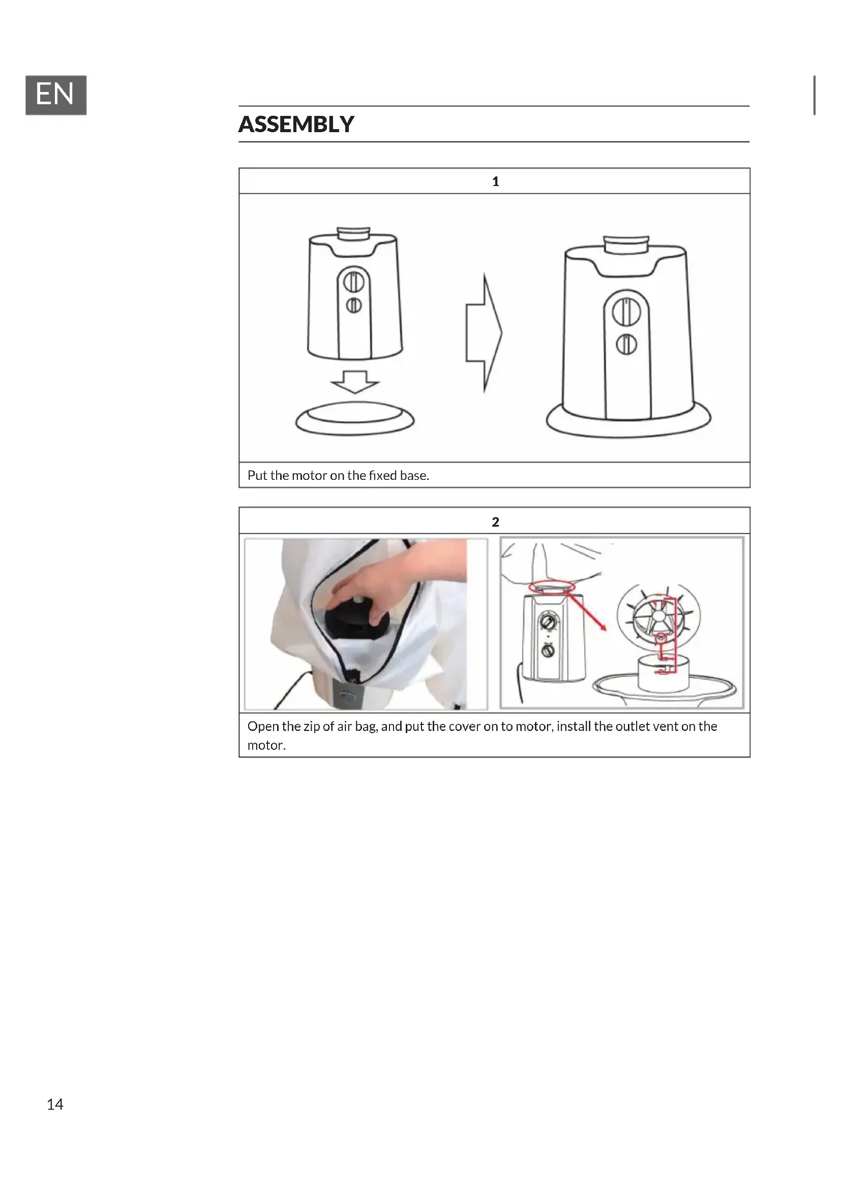 Open the zip of air bag, and put the cover on to motor, install the outlet vent on the motor.15
