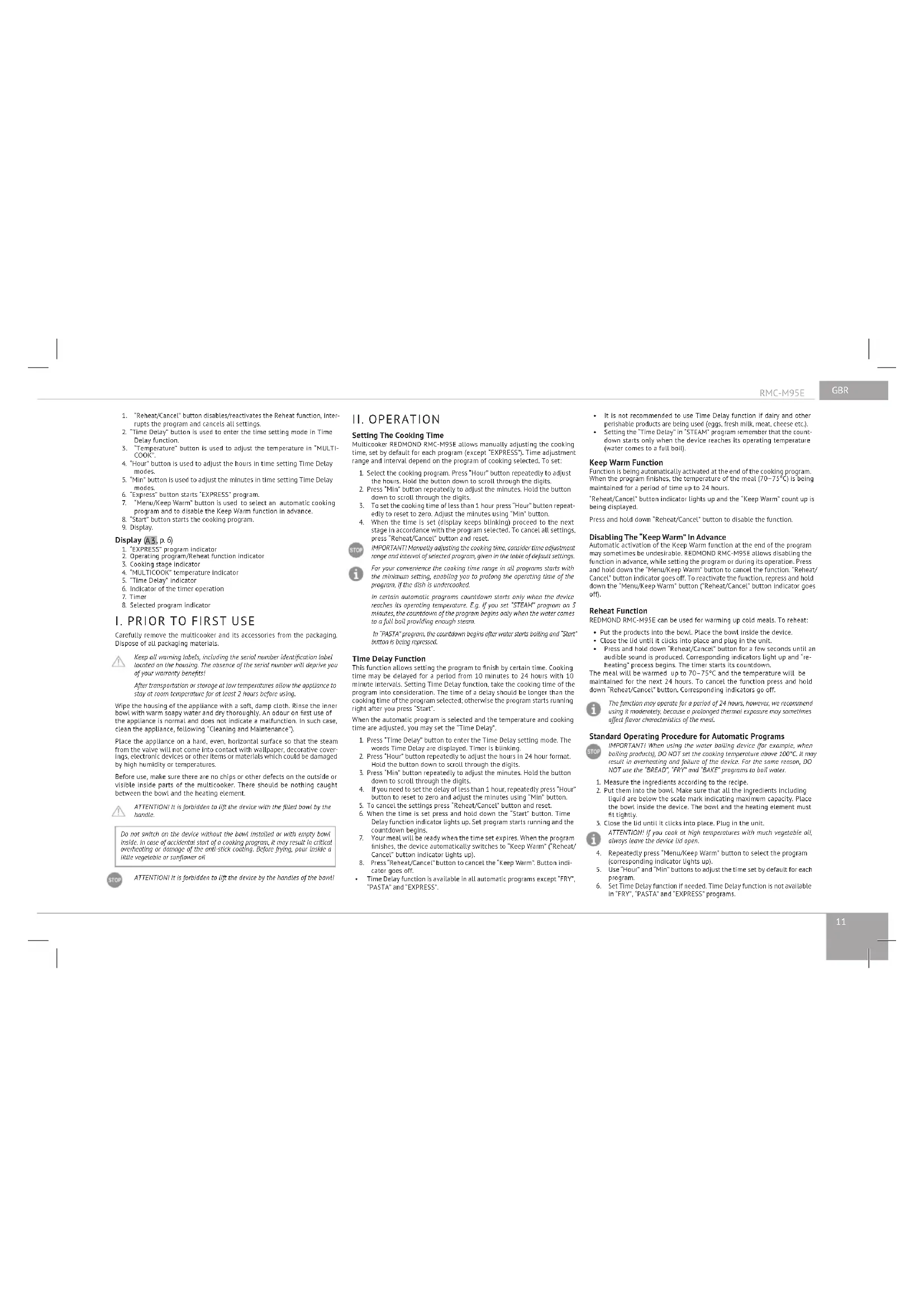 Setting the “Time Delay” in “STEAM” program remember that the count- down starts only when the device reaches its operating temperature (water comes to a full boil). Keep Warm Function Function is being automatically activated at the end of the cooking program. When the program nishes, the temperature of the meal (70–75°C) is being maintained for a period of time up to 24 hours. “Reheat/Cancel” button indicator lights up and the “Keep Warm” count up is being displayed. Press and hold down “Reheat/Cancel” button to disable the function. Disabling The “Keep Warm” In Advance Automatic activation of the Keep Warm function at the end of the program may sometimes be undesirable. REDMOND RMC-M95E allows disabling the function in advance, while setting the program or during its operation. Press and hold down the “Menu/Keep Warm” button to cancel the function. “Reheat/ Cancel” button indicator goes off. To reactivate the function, repress and hold down the “Menu/Keep Warm” button (“Reheat/Cancel” button indicator goes off). Reheat Function REDMOND RMC-M95E can be used for warming up cold meals. To reheat: