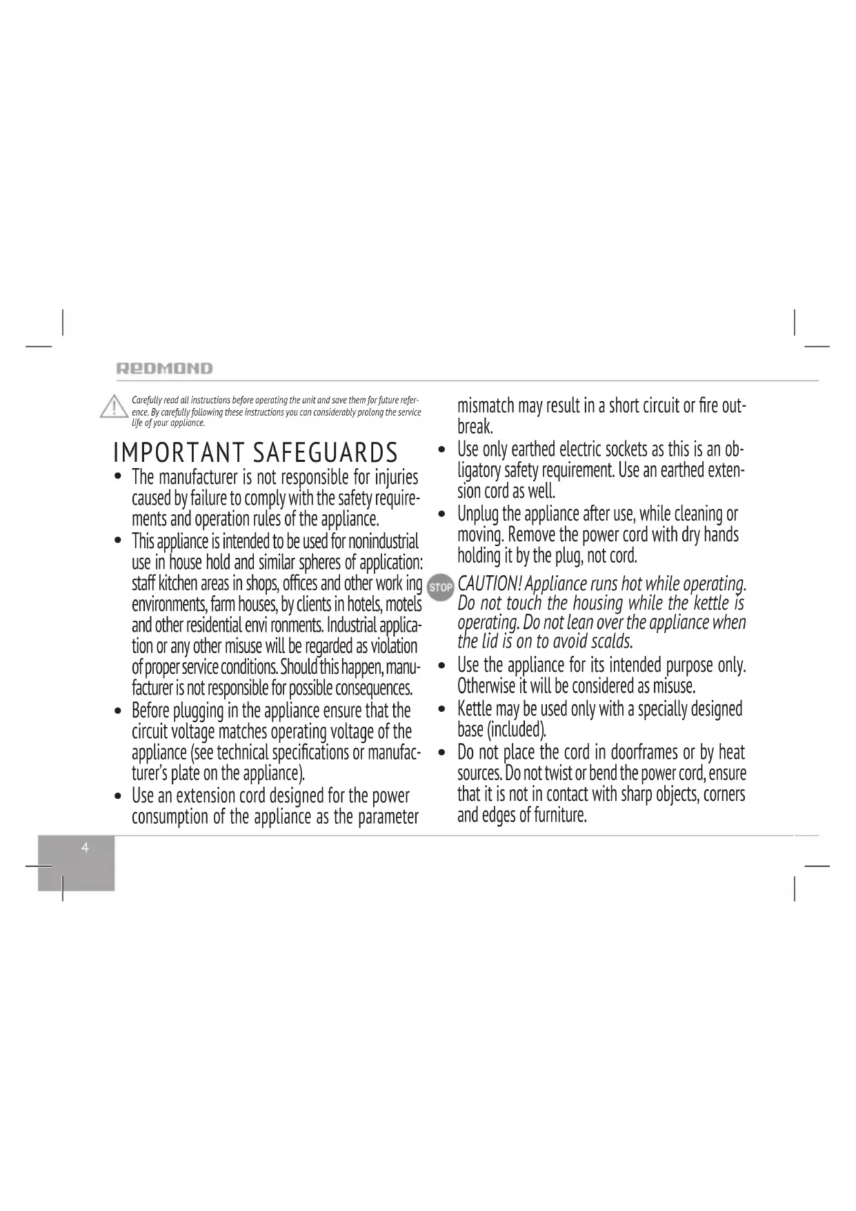Unplug the appliance after use, while cleaning or moving. Remove the power cord with dry hands holding it by the plug, not cord. CAUTION! Appliance runs hot while operating. Do not touch the housing while the kettle is operating. Do not lean over the appliance when the lid is on to avoid scalds.