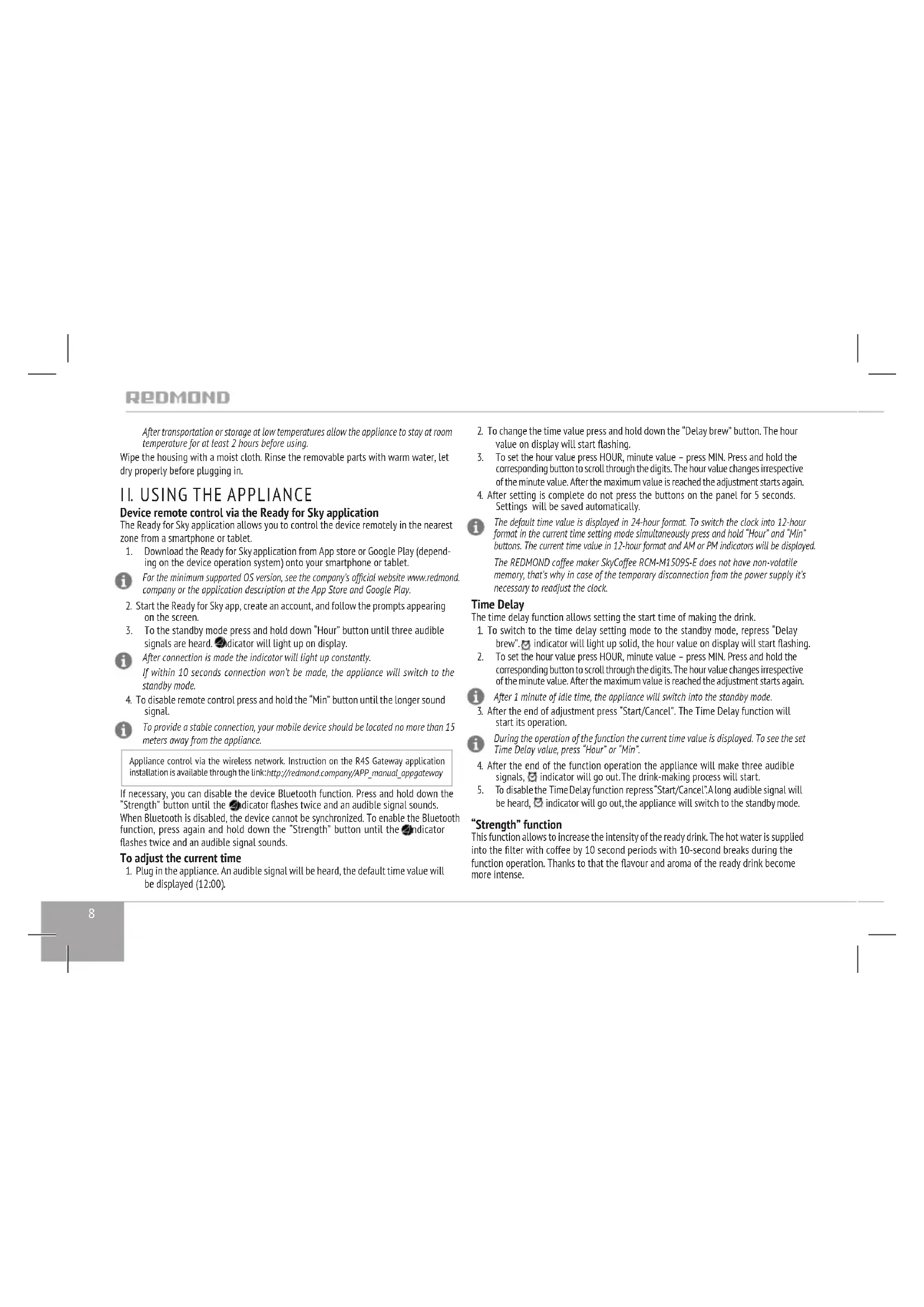 signal. To provide a stable connection, your mobile device should be located no more than 15 meters away from the appliance. Appliance control via the wireless network. Instruction on the R4S Gateway application installation is available through the link: http://redmond.company/APP_manual_appgateway If necessary, you can disable the device Bluetooth function. Press and hold down the “Strength” button until the indicator ashes twice and an audible signal sounds. When Bluetooth is disabled, the device cannot be synchronized. To enable the Bluetooth function, press again and hold down the “Strength” button until the indicator ashes twice and an audible signal sounds. To adjust the current time