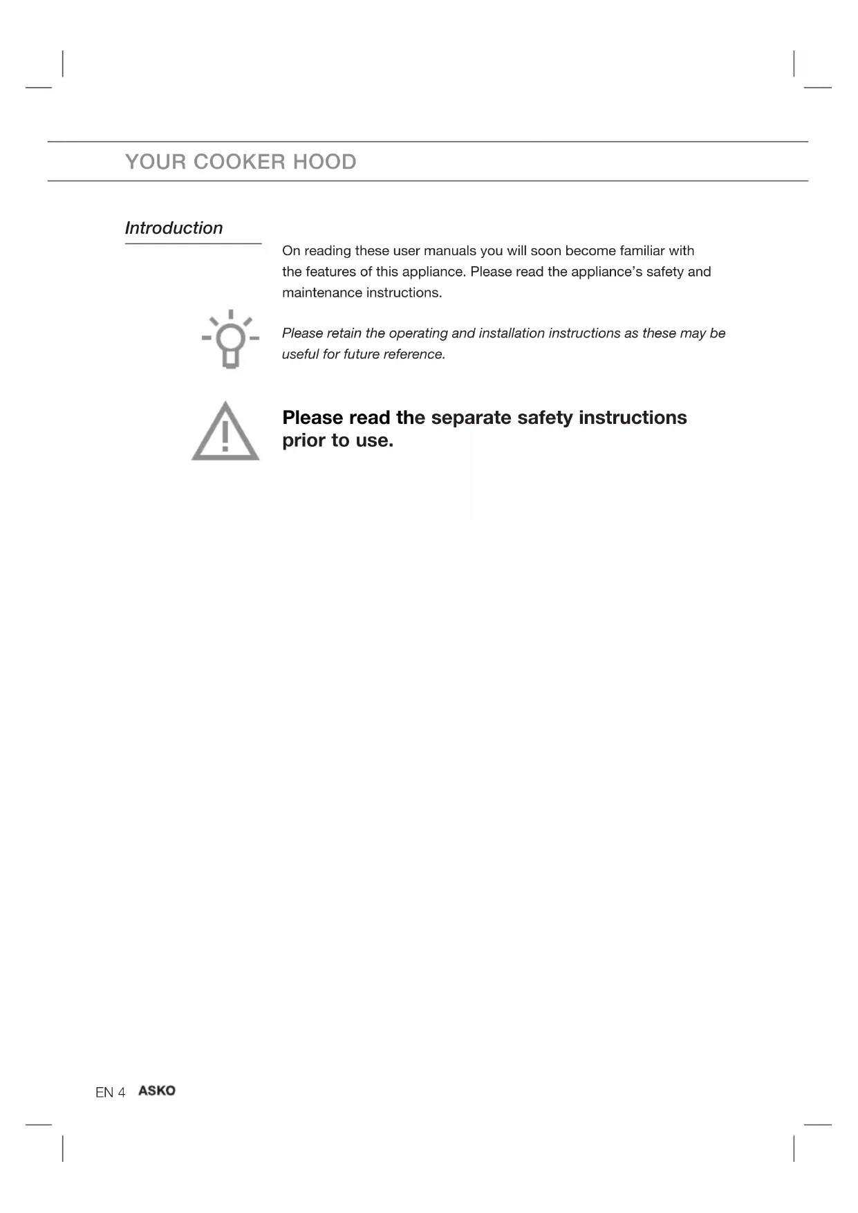 - The carbon filter indicator (3) flashes for 3 seconds. USEEN 9 Cleaning Important! For all maintenance first switch off the mains power to the cooker hood by pulling the plug out of the socket or by turning off the home's master switch. The hood needs to be cleaned regularly, both inside as well as outside (at least in the same frequency as the grease filter cleaning). Do not use abrasive cleaning products. Do not use alcohol! Important! If the instructions regarding cleaning the appliance or replacing the filters are not followed, this can cause a fire. These instructions should be followed! The manufacturer is not liable for damage to the hood or fire damage resulting from incompetent maintenance or from non-adherence to the above safety instructions. Cooker hood Clean the cooker hood with soapy water and a soft cloth. Then wash off with clean water. Do not use aggressive cleaning agents such as caustic soda. The cooker hood finish stays in good condition if it is buffed periodically following the application of wax. Stainless steel cooker hoods Do not use scouring pads or other abrasive cleaners on stainless steel cooker hoods. Finish with a non-abrasive, non-polishing agent and buff the stainless steel in the direction of the grain. Metal grease filters Metal grease filters should be cleaned once a month (or when indicated by the filter cleaning indicator – if present on the model) using a neutral cleaning agent, either by hand or in the dishwasher on a short, low- temperature program. Place the grease filters with the openings facing downwards in the dishwasher so the water can drain out of the filter. Aluminium grease filters become dull as a result of dishwasher cleaning agents. This is normal and does not effect the working. MAINTENANCEEN 10 Removing cassette filter 1 Switch off the motor and lighting. 2 Open the access hatch. 3 Remove the filter from the hood. Cleaning The filters can be cleaned in the dishwasher. Allow the filters to drain well before replacing. The filters can also be cleaned by hand. Clean the filters in soapy water with washing up liquid and rinse. Allow the filters to drain well. The underside of the cooker hood can be cleaned with a mild cleaning agent and a damp cloth. Dry off with kitchen paper or a dry tea towel. Replacing cassette filter The filter should be placed with the locking mechanism on the side. Open the filter access hatch. The notches at the side of the filter will then slot in. Hold the access hatch in this position when placing the filters. 1 Slot the notches at the back of the filter in the specially designed opening to the side of the cooker hood. 2 Tilt the filter upwards. 3 Release the filter access hatch. The notches at the back of the filter will extend outwards and slot into the specially designed openings of the cooker hood. The filter is now in position again. Please note! Replace the grease filters in their original assembled position (see figure). Positioning the grease filters correctly ensures the most efficient extraction. MAINTENANCE