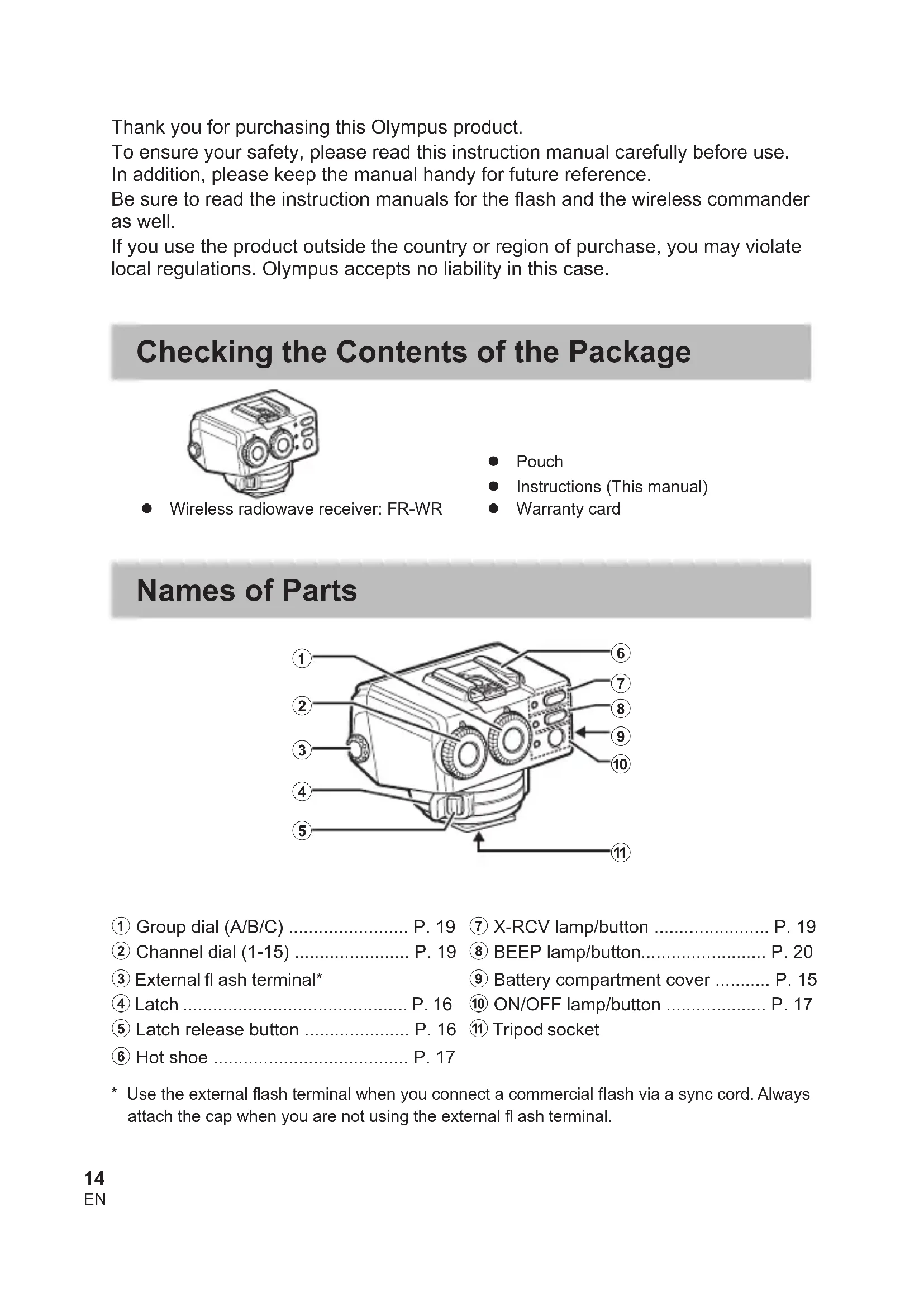 Thank you for purchasing this Olympus product. To ensure your safety, please read this instruction manual carefully before use. In addition, please keep the manual handy for future reference. Be sure to read the instruction manuals for the fl ash and the wireless commander as well. If you use the product outside the country or region of purchase, you may violate local regulations. Olympus accepts no liability in this case. Checking the Contents of the Package Wireless radiowave receiver: FR-WR Pouch Instructions (This manual) Warranty card Names of Parts