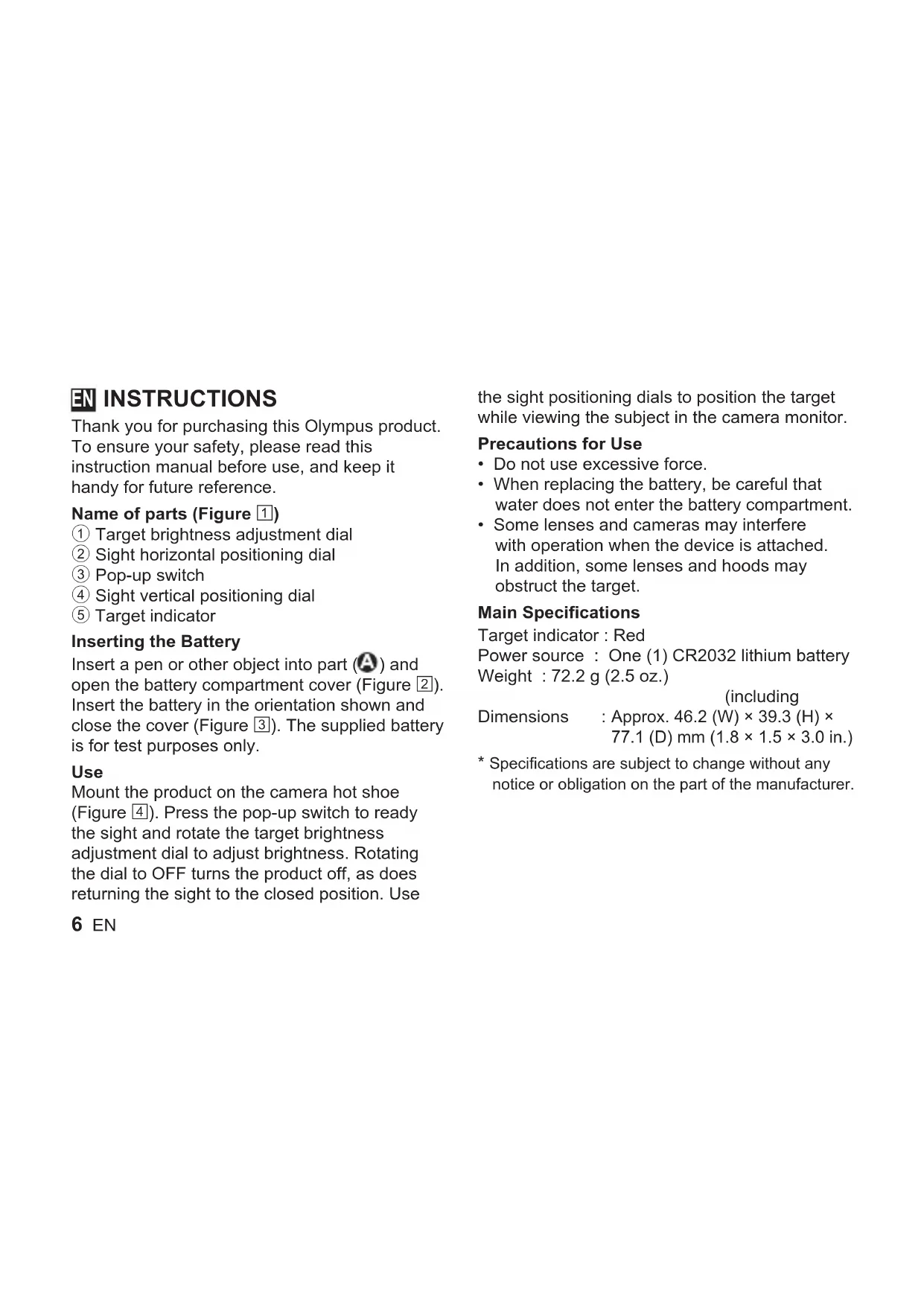 R230232L.indb5R230232L.indb5 2015/01/3017:52:032015/01/3017:52:036 EN INSTRUCTIONS Thank you for purchasing this Olympus product. To ensure your safety, please read this instruction manual before use, and keep it handy for future reference. Name of parts (Figure 1) 1 Target brightness adjustment dial 2 Sight horizontal positioning dial 3 Pop-up switch 4 Sight vertical positioning dial 5 Target indicator Inserting the Battery Insert a pen or other object into part ( ) and open the battery compartment cover (Figure 2). Insert the battery in the orientation shown and close the cover (Figure 3). The supplied battery is for test purposes only. Use Mount the product on the camera hot shoe (Figure 4). Press the pop-up switch to ready the sight and rotate the target brightness adjustment dial to adjust brightness. Rotating the dial to OFF turns the product off, as does returning the sight to the closed position. Use the sight positioning dials to position the target while viewing the subject in the camera monitor. Precautions for Use