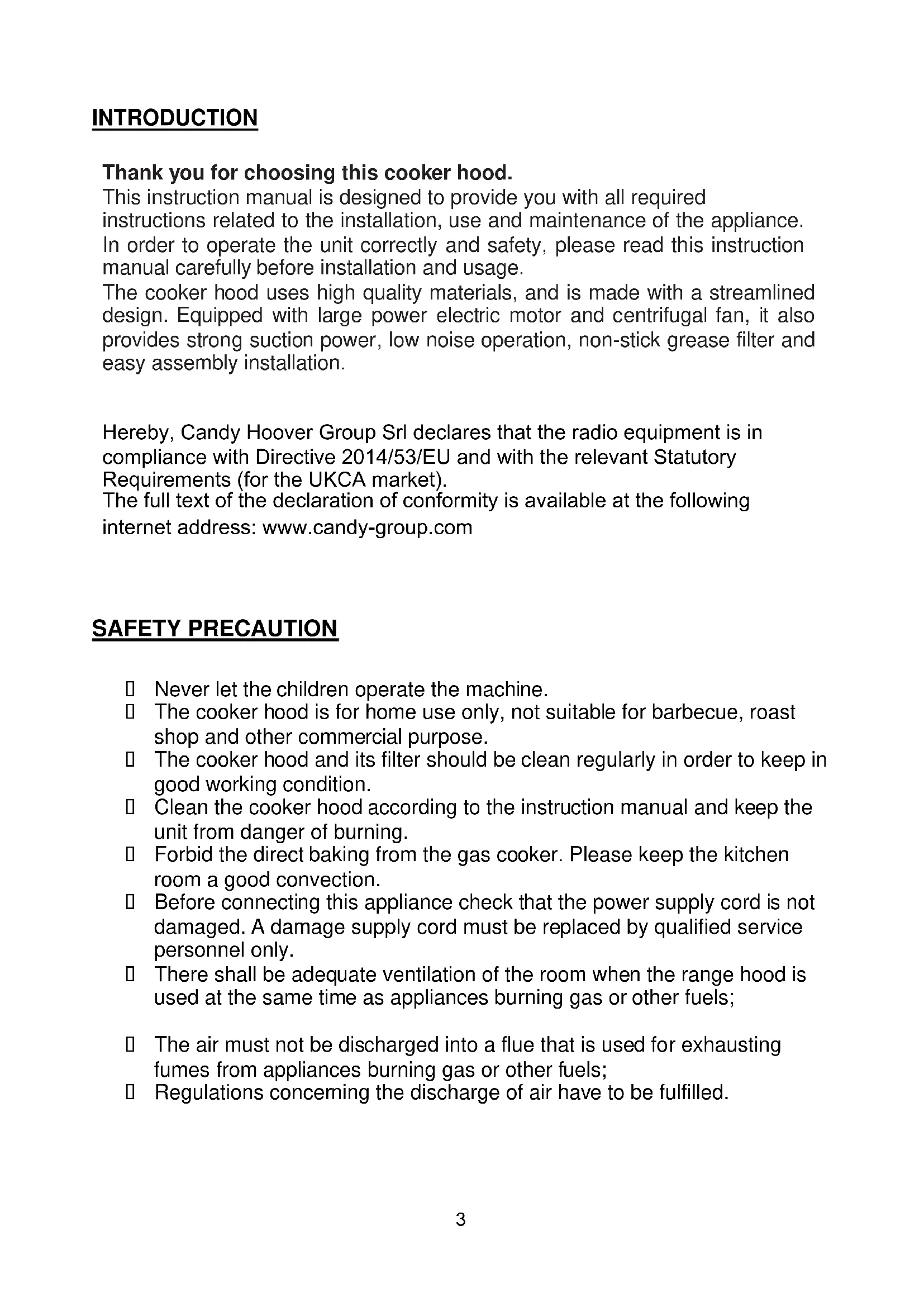 2INTRODUCTION Thank you for choosing this cooker hood. This instruction manual is designed to provide you with all required instructions related to the installation, use and maintenance of the appliance. In order to operate the unit correctly and safety, please read this instruction manual carefully before installation and usage. The cooker hood uses high quality materials, and is made with a streamlined design. Equipped with large power electric motor and centrifugal fan, it also provides strong suction power, low noise operation, non-stick grease filter and easy assembly installation. Hereby, Candy Hoover Group Srl declares that the radio equipment is in compliance with Directive 2014/53/EU and with the relevant Statutory Requirements (for the UKCA market). internet address: www.candy-group.com SAFETY PRECAUTION Never let the children operate the machine. The cooker hood is for home use only, not suitable for barbecue, roast shop and other commercial purpose. The cooker hood and its filter should be clean regularly in order to keep in good working condition. Clean the cooker hood according to the instruction manual and keep the unit from danger of burning. Forbid the direct baking from the gas cooker. Please keep the kitchen room a good convection. Before connecting this appliance check that the power supply cord is not damaged. A damage supply cord must be replaced by qualified service personnel only. There shall be adequate ventilation of the room when the range hood is used at the same time as appliances burning gas or other fuels; The air must not be discharged into a flue that is used for exhausting fumes from appliances burning gas or other fuels; Regulations concerning the discharge of air have to be fulfilled.