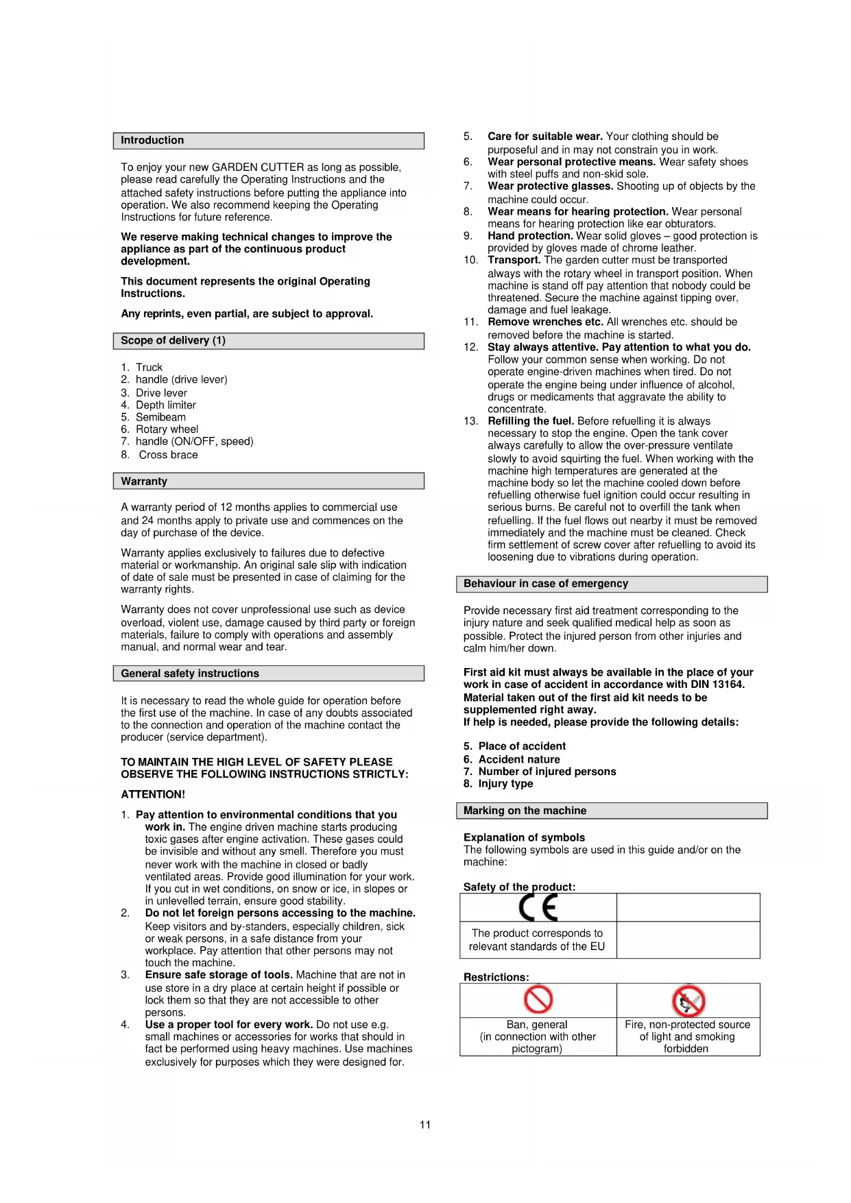 necessary to stop the engine. Open the tank cover always carefully to allow the over-pressure ventilate slowly to avoid squirting the fuel. When working with the machine high temperatures are generated at the machine body so let the machine cooled down before refuelling otherwise fuel ignition could occur resulting in serious burns. Be careful not to overfill the tank when refuelling. If the fuel flows out nearby it must be removed immediately and the machine must be cleaned. Check firm settlement of screw cover after refuelling to avoid its loosening due to vibrations during operation. Behaviour in case of emergency Provide necessary first aid treatment corresponding to the injury nature and seek qualified medical help as soon as possible. Protect the injured person from other injuries and calm him/her down. First aid kit must always be available in the place of your work in case of accident in accordance with DIN 13164. Material taken out of the first aid kit needs to be supplemented right away. If help is needed, please provide the following details: