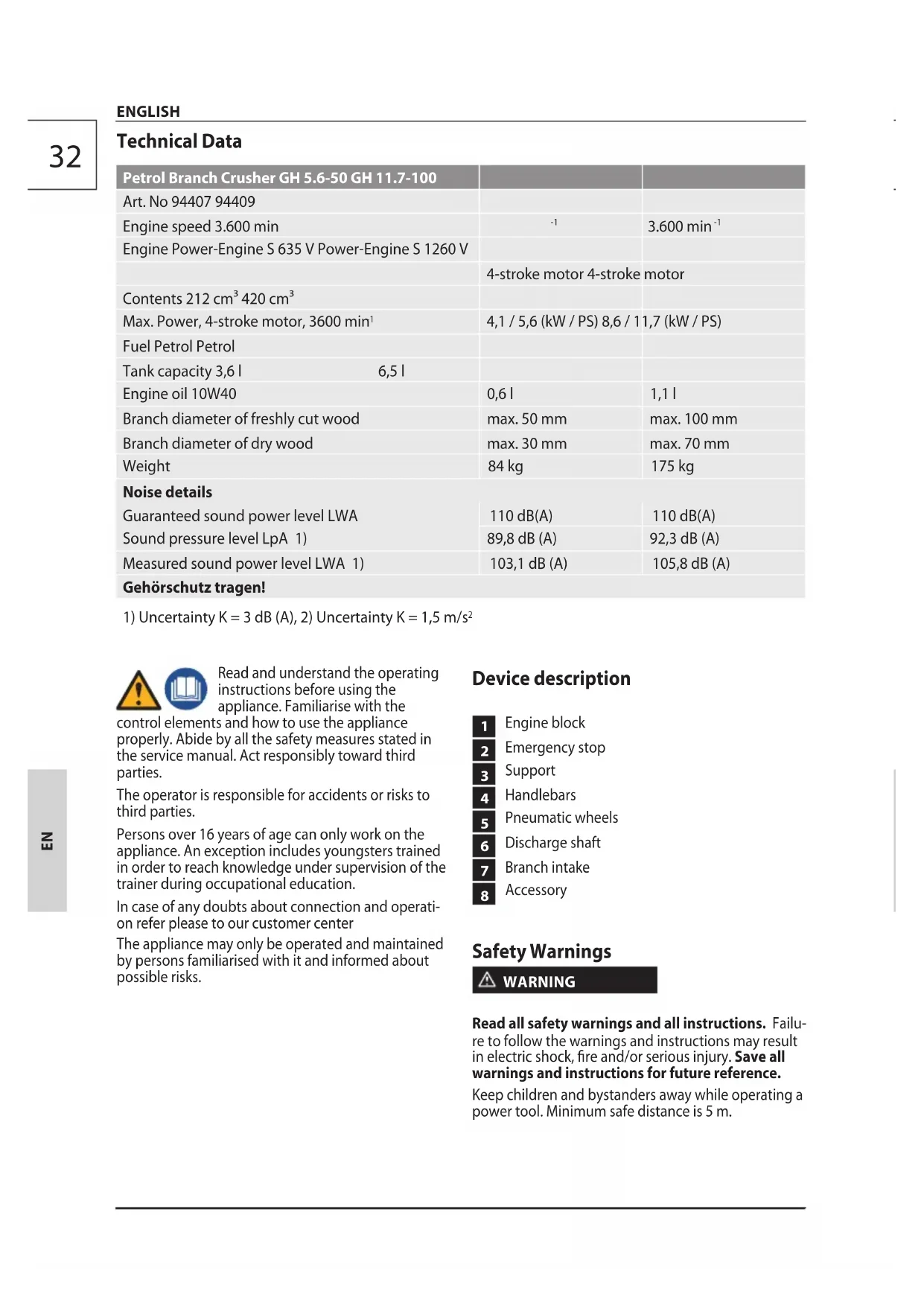 - Proper function of the on and o button, incl. the emergency switch. Before starting the machine, make sure that the feeder is empty. The appliance must not be used if damaged or safety equipment is defective. Replace any worn-out and damaged parts. Do not stand in the ejection zone when operating the machine. The engine must be lled with engine oil before the initial commissioning. Check the oil level every time before commissioning. Fill with engine oil if required. Work area safety Use this device in well-ventilated outdoor areas only. In closed rooms, exhaust gases containing carbon monoxide may have fatal eects. When being operated, the machine must stand on a horizontal and at surface and the oor around the machine must be at, well-maintained and with no waste, such as sawdust and cuttings. Keep work area clean and well lit. Cluttered or dark areas invite accidents. The machine may only be used if it is fully assembled. Operation of a machine that is not fully assembled is strictly prohibited. Transport Handling equipment to be used only when handling the machine. Make sure the device cannot roll away, fall over or tip over with suitable fastening devices. Do not transport the machine if the energy source is running. Emergency procedure Conduct a rst-aid procedure adequate to the injury and summon qualied medical attendance as quickly as possible. Protect the injured person from further harm and calm them down. If you seek help,state the following pieces ofinformation: 1. Accident site, 2. Accident type, 3. Number of injured persons, 4. Injury type(s) Residual Risk Despite the observance of the operating instructions there still may be some hidden residual risks. ENGLISH36