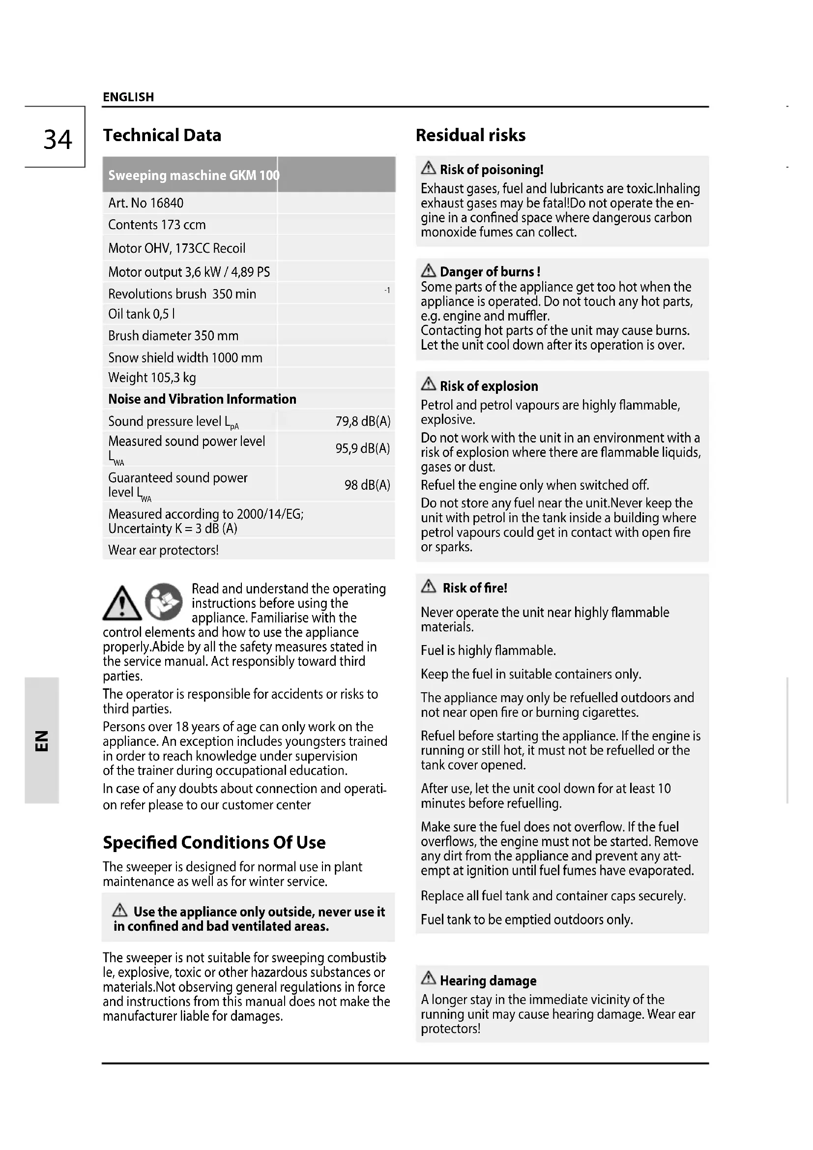 ENGLISH Residual risks Risk of poisoning! Exhaust gases, fuel and lubricants are toxic.Inhaling exhaust gases may be fatal!Do not operate the en