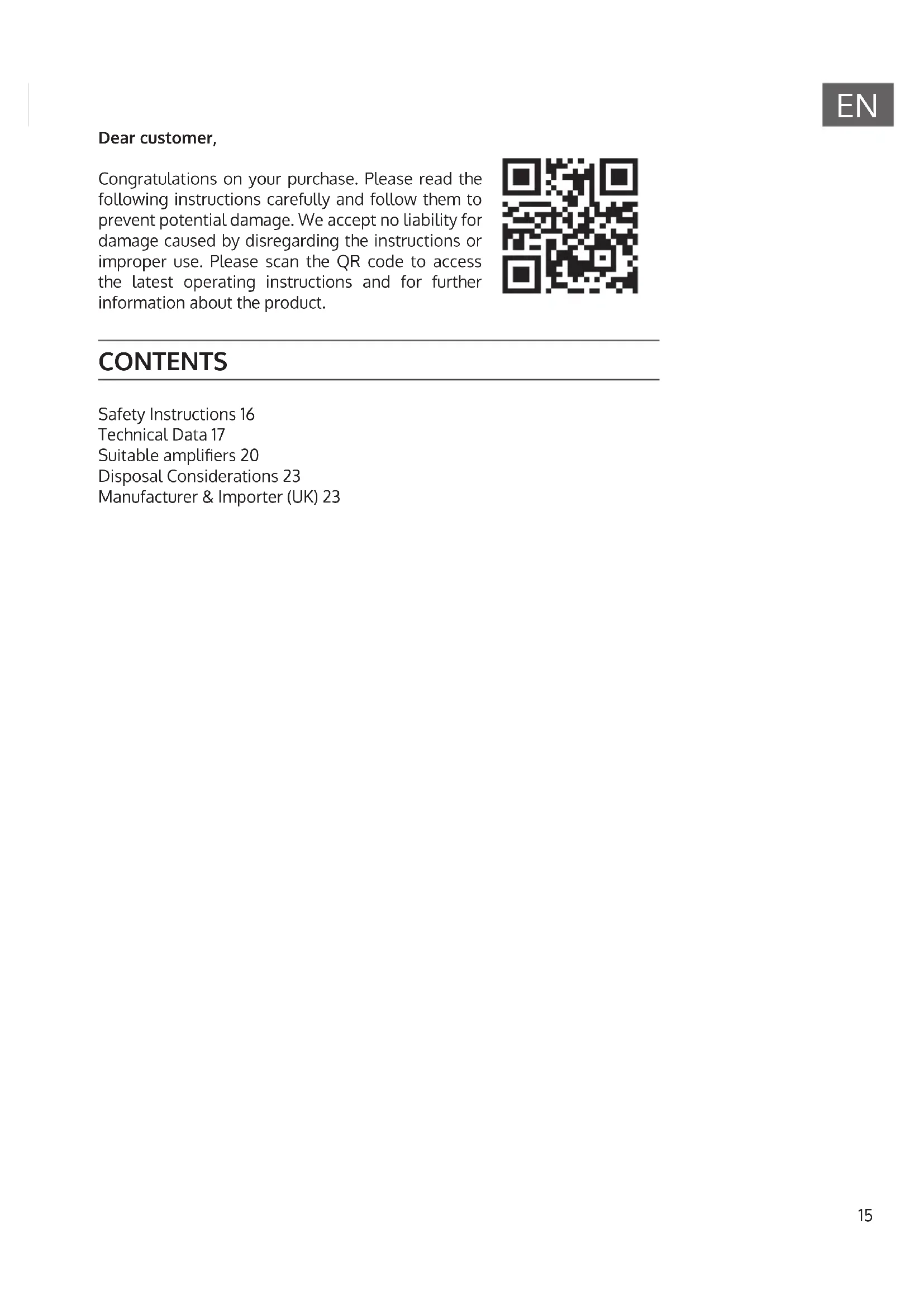 Dear customer, Congratulations on your purchase. Please read the following instructions carefully and follow them to prevent potential damage. We accept no liability for damage caused by disregarding the instructions or improper use. Please scan the QR code to access the latest operating instructions and for further information about the product. CONTENTS Safety Instructions 16 Technical Data 17 Suitable ampliers 20 Disposal Considerations 23 Manufacturer & Importer (UK) 2316