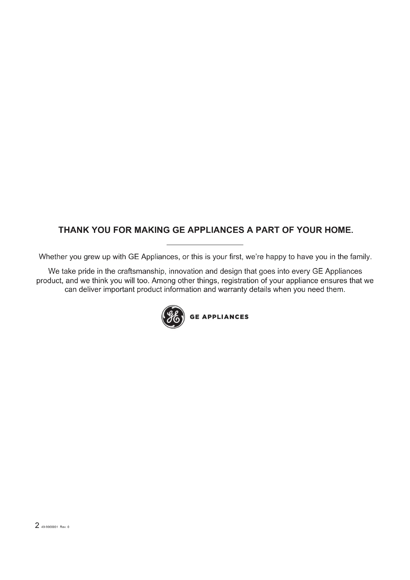 TROUBLESHOOTING .............6 LIMITED WARRANTY ............7 CONSUMER SUPPORT ...........82 49-9000001 Rev. 0 THANK YOU FOR MAKING GE APPLIANCES A PART OF YOUR HOME. Whether you grew up with GE Appliances, or this is your first, we’re happy to have you in the family. We take pride in the craftsmanship, innovation and design that goes into every GE Appliances product, and we think you will too. Among other things, registration of your appliance ensures that we can deliver important product information and warranty details when you need them.49-9000001 Rev. 0 3 SAFETY INFORMATION
