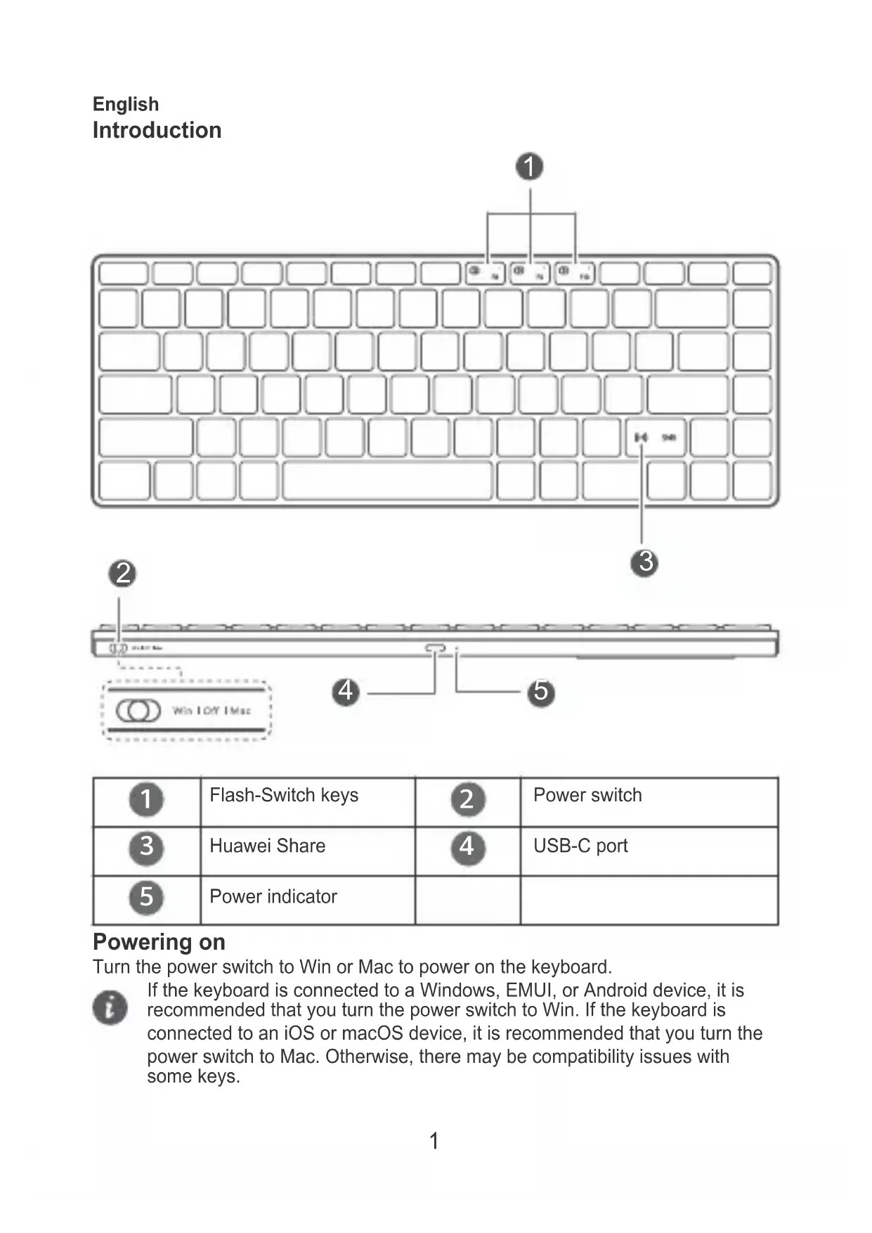 Power indicator Powering on Turn the power switch to Win or Mac to power on the keyboard. If the keyboard is connected to a Windows, EMUI, or Android device, it is recommended that you turn the power switch to Win. If the keyboard is connected to an iOS or macOS device, it is recommended that you turn the power switch to Mac. Otherwise, there may be compatibility issues with some keys. 1Connecting 1 Place the keyboard close to a device and press and hold any Flash-Switch key for more than three seconds to start pairing. (After the keyboard is powered on for the first time, it will automatically start pairing without the need for you to press and hold a Flash-Switch key.) 2 A prompt will then be displayed on the device. Follow the onscreen instructions to finish pairing.