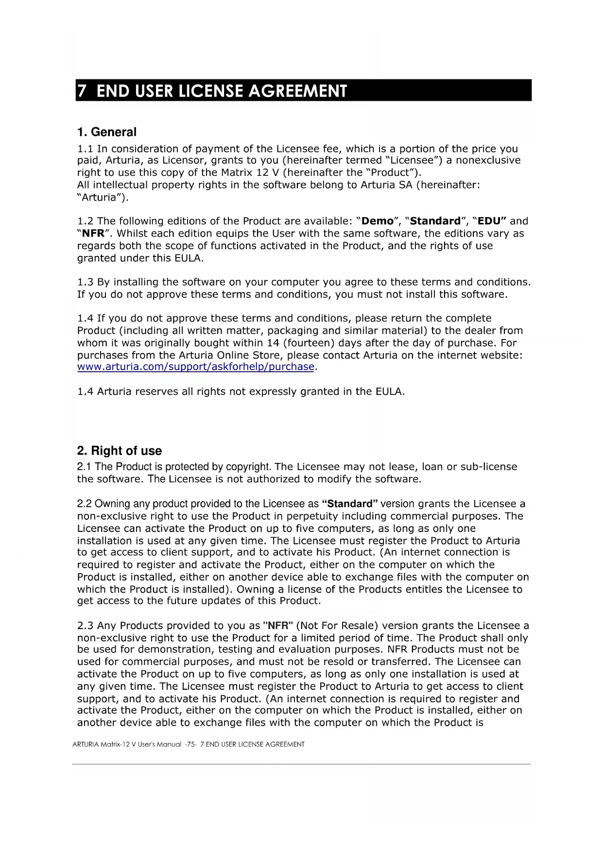 non-exclusive right to use the Product for a limited period of time. The Product shall only be used for demonstration, testing and evaluation purposes. NFR Products must not be used for commercial purposes, and must not be resold or transferred. The Licensee can activate the Product on up to five computers, as long as only one installation is used at any given time. The Licensee must register the Product to Arturia to get access to client support, and to activate his Product. (An internet connection is required to register and activate the Product, either on the computer on which the Product is installed, either on another device able to exchange files with the computer on which the Product isARTURIA Matrix-12 V User's Manual -76- 7 END USER LICENSE AGREEMENT installed). NFR Products are exempt from update, upgrade or crossgrade offers, and cannot be purchased with or exchanged for vouchers or coupons. Furthermore, as an owner of a NFR Product, you are not entitled to any vouchers that ship with the standard version of the Product.