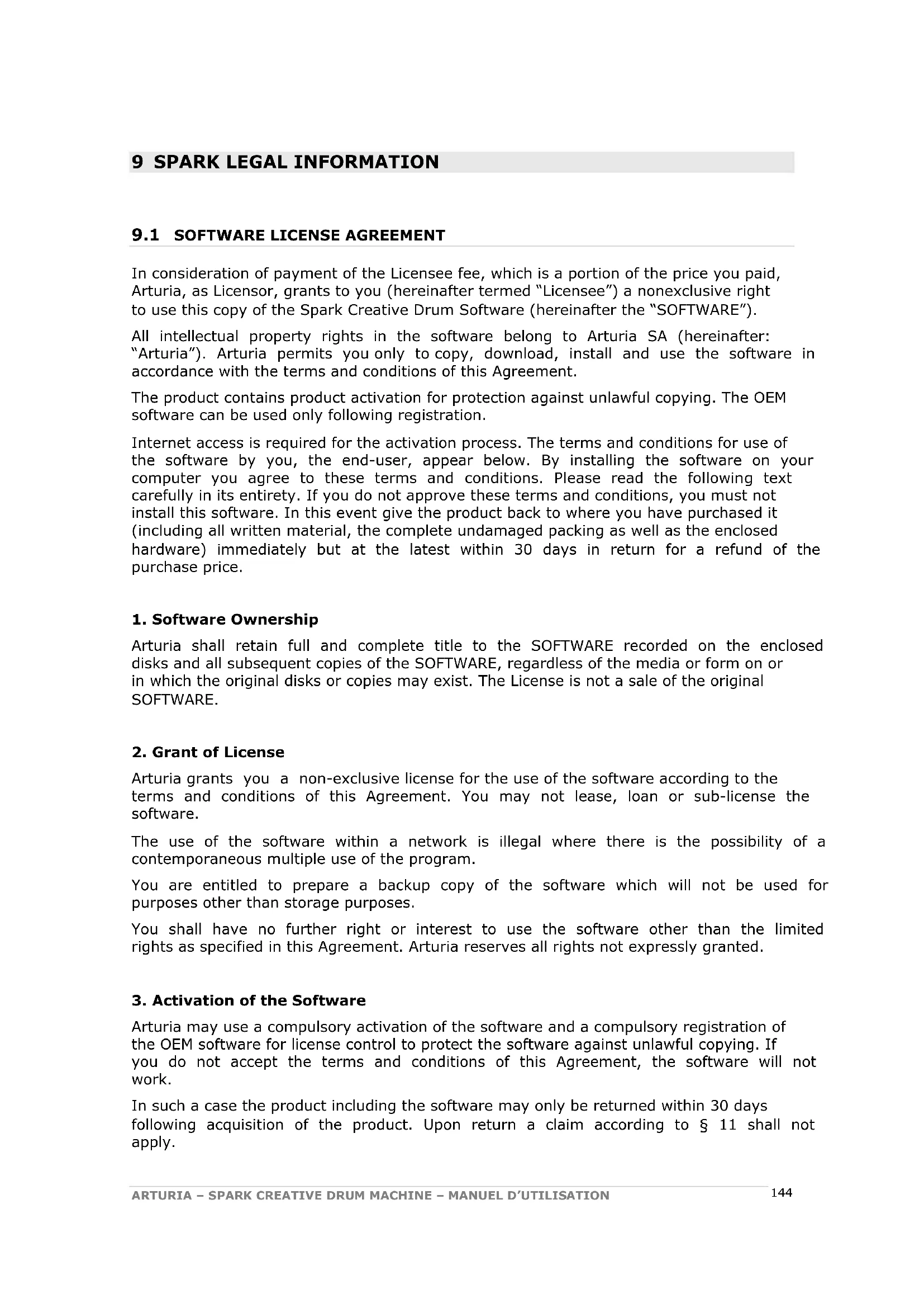 Arturia may use a compulsory activation of the software and a compulsory registration of the OEM software for license control to protect the software against unlawful copying. If you do not accept the terms and conditions of this Agreement, the software will not work. In such a case the product including the software may only be returned within 30 days following acquisition of the product. Upon return a claim according to § 11 shall not apply.ARTURIA – SPARK CREATIVE DRUM MACHINE – MANUEL D’UTILISATION