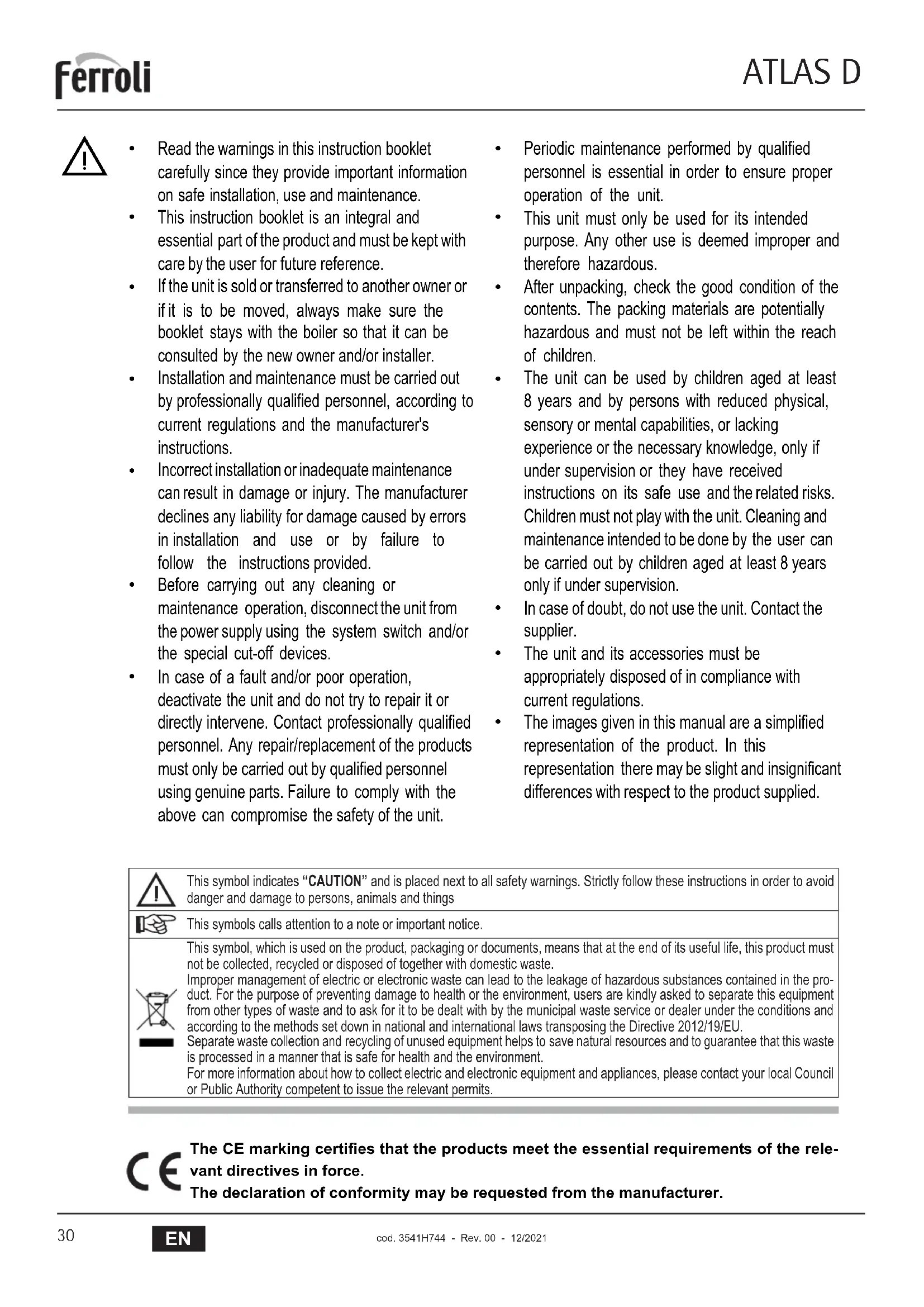 Download the instructions for your Central heating boiler in PDF format for free! Find your manual Atlas D - FERROLI and take your electronic device back in hand. On this page are published all the documents necessary for the use of your device. Atlas D by FERROLI.