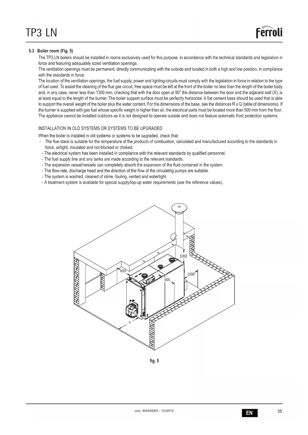 The TP3 LN boilers should be installed in rooms exclusively used for this purpose, in accordance with the technical standards and legislation in force and featuring adequately sized ventilation openings. The ventilation openings must be permanent, directly communicating with the outside and located in both a high and low position, in compliance with the standards in force. The location of the ventilation openings, the fuel supply, power and lighting circuits must comply with the legislation in force in relation to the type of fuel used. To assist the cleaning of the flue gas circuit, free space must be left at the front of the boiler no less than the length of the boiler body and, in any case, never less than 1300 mm, checking that with the door open at 90° the distance between the door and the adjacent wall (X), is at least equal to the length of the burner. The boiler support surface must be perfectly horizontal. A flat cement base should be used that is able to support the overall weight of the boiler plus the water content. For the dimensions of the base, see the distances R x Q (table of dimensions). If the burner is supplied with gas fuel whose specific weight is higher than air, the electrical parts must be located more than 500 mm from the floor. The appliance cannot be installed outdoors as it is not designed to operate outside and does not feature automatic frost protection systems. INSTALLATION IN OLD SYSTEMS OR SYSTEMS TO BE UPGRADED When the boiler is installed in old systems or systems to be upgraded, check that: - The flue stack is suitable for the temperature of the products of combustion, calculated and manufactured according to the standards in force, airtight, insulated and not blocked or choked. - The electrical system has been installed in compliance with the relevant standards by qualified personnel. - The fuel supply line and any tanks are made according to the relevant standards. - The expansion vessel/vessels can completely absorb the expansion of the fluid contained in the system. - The flow-rate, discharge head and the direction of the flow of the circulating pumps are suitable. - The system is washed, cleaned of slime, fouling, vented and watertight. - A treatment system is available for special supply/top-up water requirements (see the reference values).
