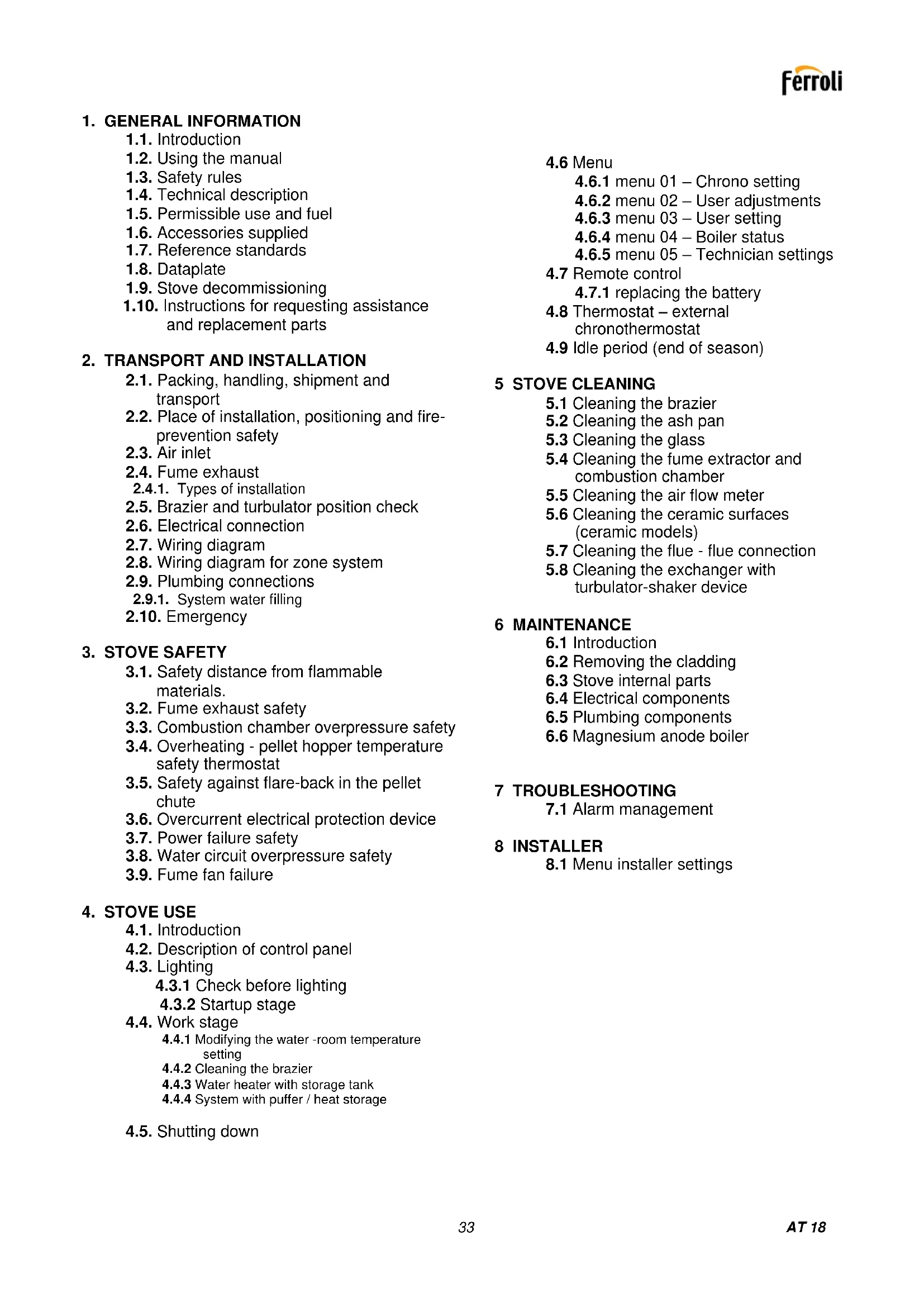 Restart the stove normally. Pellet hopper thermostat activation temperature: > 85°C Heating chamber thermostat activation temperature: > 95°C44 AT 18 - the boiler must only operate with the fire door always closed. - the fire and ash door seals must be checked periodically to prevent air from entering; - to ensure thermal efficiency and correct operation it is necessary to clean the brazier every time pellets are loaded; - when lighting the stove for the first time, allow it to heat up gradually by setting low operating temperatures (see the section on temperature setting); - during lighting, operation and shutdown, the stove may creak a little due to the heat expansion.