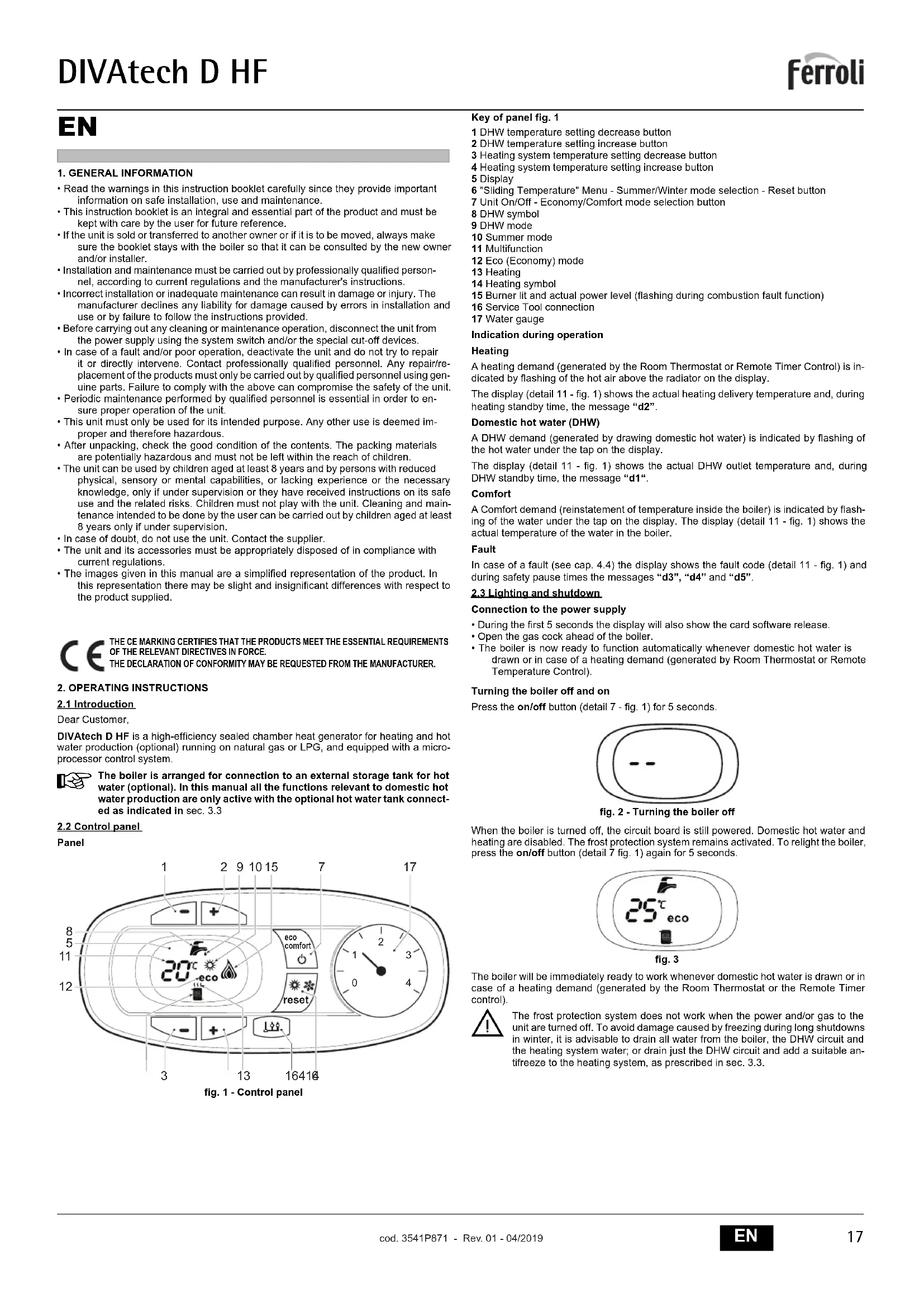 1. GENERAL INFORMATION• Read the warnings in this instruction booklet carefully since they provide importantinformation on safe installation, use and maintenance.• This instruction booklet is an integral and essential part of the product and must bekept with care by the user for future reference.• If the unit is sold or transferred to another owner or if it is to be moved, always makesure the booklet stays with the boiler so that it can be consulted by the new ownerand/or installer.• Installation and maintenance must be carried out by professionally qualified person-nel, according to current regulations and the manufacturer's instructions.• Incorrect installation or inadequate maintenance can result in damage or injury. Themanufacturer declines any liability for damage caused by errors in installation anduse or by failure to follow the instructions provided.• Before carrying out any cleaning or maintenance operation, disconnect the unit fromthe power supply using the system switch and/or the special cut-off devices.• In case of a fault and/or poor operation, deactivate the unit and do not try to repairit or directly intervene. Contact professionally qualified personnel. Any repair/re-placement of the products must only be carried out by qualified personnel using gen-uine parts. Failure to comply with the above can compromise the safety of the unit.• Periodic maintenance performed by qualified personnel is essential in order to en-sure proper operation of the unit.• This unit must only be used for its intended purpose. Any other use is deemed im-proper and therefore hazardous.• After unpacking, check the good condition of the contents. The packing materialsare potentially hazardous and must not be left within the reach of children.• The unit can be used by children aged at least 8 years and by persons with reducedphysical, sensory or mental capabilities, or lacking experience or the necessaryknowledge, only if under supervision or they have received instructions on its safeuse and the related risks. Children must not play with the unit. Cleaning and main-tenance intended to be done by the user can be carried out by children aged at least8 years only if under supervision.• In case of doubt, do not use the unit. Contact the supplier.• The unit and its accessories must be appropriately disposed of in compliance withcurrent regulations.• The images given in this manual are a simplified representation of the product. Inthis representation there may be slight and insignificant differences with respect tothe product supplied.2. OPERATING INSTRUCTIONS2.1 IntroductionDear Customer,DIVAtech D HF is a high-efficiency sealed chamber heat generator for heating and hotwater production (optional) running on natural gas or LPG, and equipped with a micro-processor control system. The boiler is arranged for connection to an external storage tank for hotwater (optional). In this manual all the functions relevant to domestic hotwater production are only active with the optional hot water tank connect-ed as indicated in sec. 3.32.2 Control panelPanelfig. 1 - Control panelKey of panel fig. 11 DHW temperature setting decrease button2 DHW temperature setting increase button3 Heating system temperature setting decrease button4 Heating system temperature setting increase button5 Display6 "Sliding Temperature" Menu - Summer/Winter mode selection - Reset button7 Unit On/Off - Economy/Comfort mode selection button8 DHW symbol9 DHW mode10 Summer mode11 Multifunction12 Eco (Economy) mode13 Heating14 Heating symbol15 Burner lit and actual power level (flashing during combustion fault function)16 Service Tool connection17 Water gaugeIndication during operationHeatingA heating demand (generated by the Room Thermostat or Remote Timer Control) is in-dicated by flashing of the hot air above the radiator on the display.The display (detail 11 - fig. 1) shows the actual heating delivery temperature and, duringheating standby time, the message “d2”.Domestic hot water (DHW)A DHW demand (generated by drawing domestic hot water) is indicated by flashing ofthe hot water under the tap on the display.The display (detail 11 - fig. 1) shows the actual DHW outlet temperature and, duringDHW standby time, the message “d1“.ComfortA Comfort demand (reinstatement of temperature inside the boiler) is indicated by flash-ing of the water under the tap on the display. The display (detail 11 - fig. 1) shows theactual temperature of the water in the boiler.FaultIn case of a fault (see cap. 4.4) the display shows the fault code (detail 11 - fig. 1) and during safety pause times the messages “d3”, “d4” and “d5”. 2.3 Lighting and shutdownConnection to the power supply• During the first 5 seconds the display will also show the card software release.• Open the gas cock ahead of the boiler.• The boiler is now ready to function automatically whenever domestic hot water isdrawn or in case of a heating demand (generated by Room Thermostat or RemoteTemperature Control).Turning the boiler off and on Press the on/off button (detail 7 - fig. 1) for 5 seconds. fig. 2 - Turning the boiler offWhen the boiler is turned off, the circuit board is still powered. Domestic hot water andheating are disabled. The frost protection system remains activated. To relight the boiler,press the on/off button (detail 7 fig. 1) again for 5 seconds.fig. 3The boiler will be immediately ready to work whenever domestic hot water is drawn or incase of a heating demand (generated by the Room Thermostat or the Remote Timercontrol). The frost protection system does not work when the power and/or gas to theunit are turned off. To avoid damage caused by freezing during long shutdownsin winter, it is advisable to drain all water from the boiler, the DHW circuit andthe heating system water; or drain just the DHW circuit and add a suitable an-tifreeze to the heating system, as prescribed in sec. 3.3.THE CE MARKING CERTIFIES THAT THE PRODUCTS