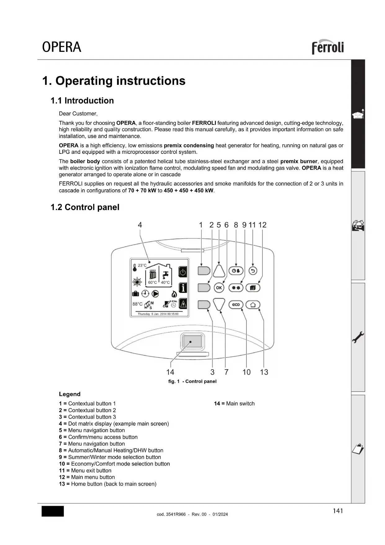 Dear Customer, Thank you for choosing OPERA, a floor-standing boiler FERROLI featuring advanced design, cutting-edge technology, high reliability and quality construction. Please read this manual carefully, as it provides important information on safe installation, use and maintenance. OPERA is a high efficiency, low emissions premix condensing heat generator for heating, running on natural gas or LPG and equipped with a microprocessor control system. The boiler body consists of a patented helical tube stainless-steel exchanger and a steel premix burner, equipped with electronic ignition with ionization flame control, modulating speed fan and modulating gas valve. OPERA is a heat generator arranged to operate alone or in cascade FERROLI supplies on request all the hydraulic accessories and smoke manifolds for the connection of 2 or 3 units in cascade in configurations of 70 + 70 kW to 450 + 450 + 450 kW.