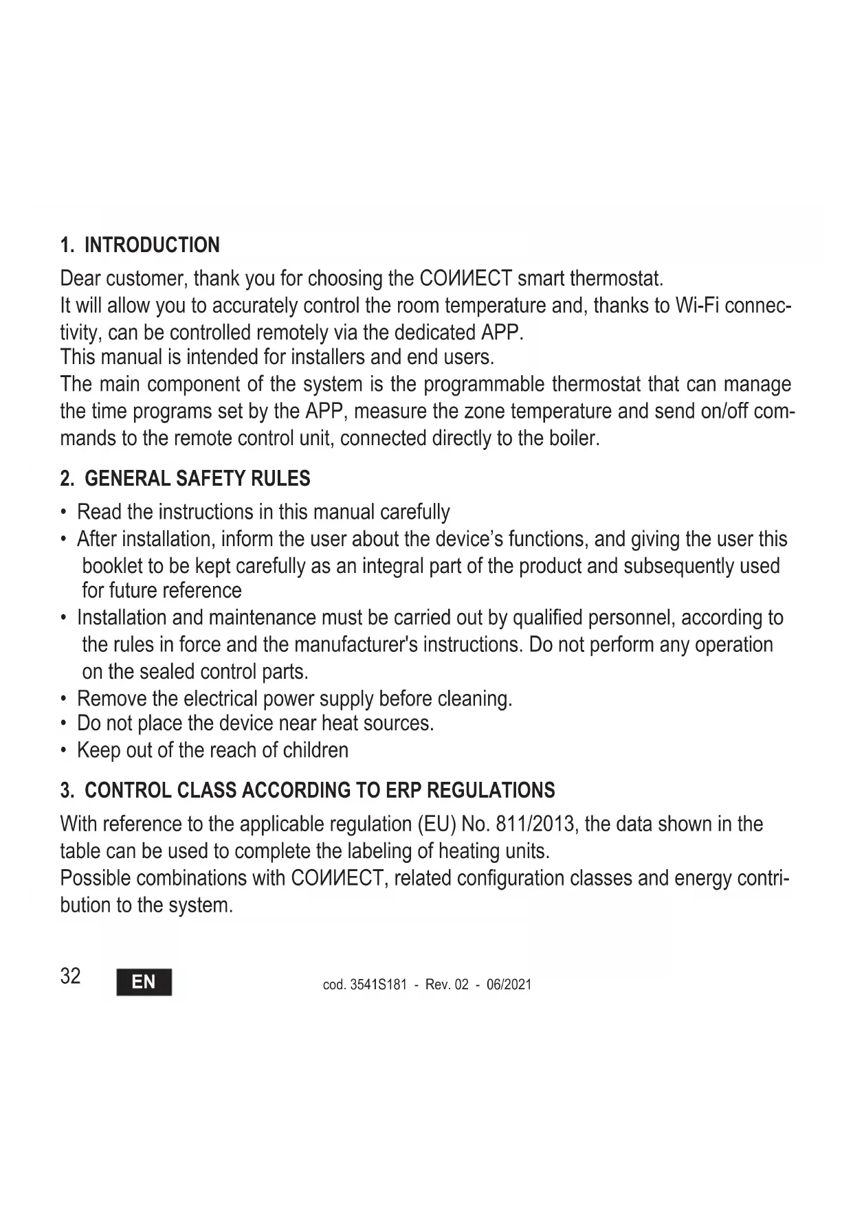 Dear customer, thank you for choosing the COИИECT smart thermostat. It will allow you to accurately control the room temperature and, thanks to Wi-Fi connec- tivity, can be controlled remotely via the dedicated APP. This manual is intended for installers and end users. The main component of the system is the programmable thermostat that can manage the time programs set by the APP, measure the zone temperature and send on/off com- mands to the remote control unit, connected directly to the boiler.