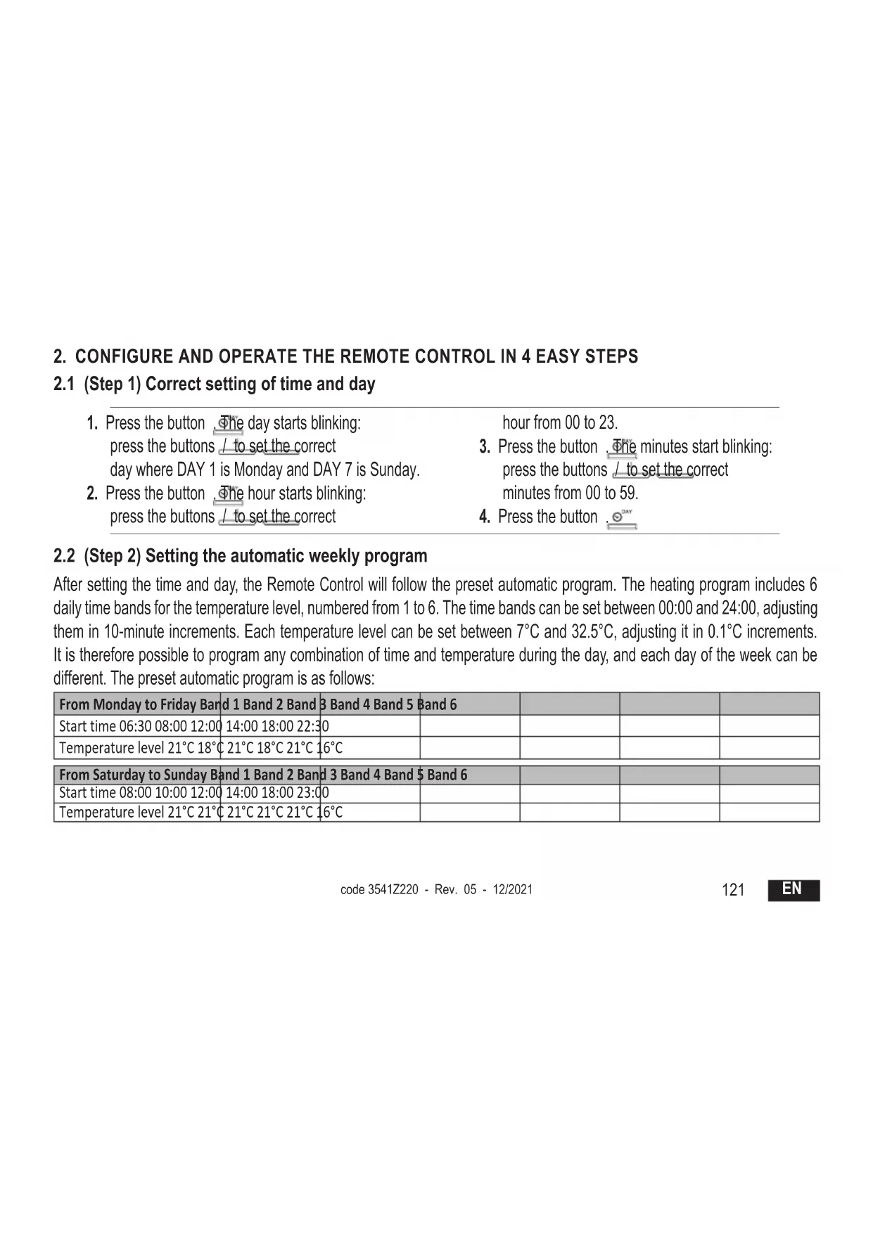 After setting the time and day, the Remote Control will follow the preset automatic program. The heating program includes 6 daily time bands for the temperature level, numbered from 1 to 6. The time bands can be set between 00:00 and 24:00, adjusting them in 10-minute increments. Each temperature level can be set between 7°C and 32.5°C, adjusting it in 0.1°C increments. It is therefore possible to program any combination of time and temperature during the day, and each day of the week can be different. The preset automatic program is as follows: From Monday to Friday Band 1 Band 2 Band 3 Band 4 Band 5 Band 6 Start time 06:30 08:00 12:00 14:00 18:00 22:30 Temperature level 21°C 18°C 21°C 18°C 21°C 16°C From Saturday to Sunday Band 1 Band 2 Band 3 Band 4 Band 5 Band 6 Start time 08:00 10:00 12:00 14:00 18:00 23:00 Temperature level 21°C 21°C 21°C 21°C 21°C 16°C code 3541Z220 - Rev. 05 - 12/2021